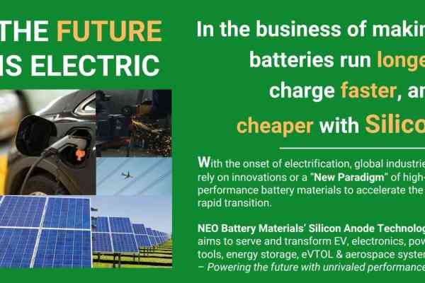 E-Mobilität, Drohnen, Robotik und Künstliche Intelligenz sind Megatrends. Milliarden an Kapital fließen in diese Branchen. Ein Bereich steht derzeit im Fokus: Die Energiespeicher! Sie gewährleisten den stabilen Lauf von Millionen von Applikationen, Maschinen und Anwendungen. Die Industrialisierung 4.0 geht mit einem immensen Energieverbrauch in die nächste Runde. Ohne kapazitätsstarke Batterien funktionieren weder Roboter, noch Drohnen oder E-Autos. Noch ist der aktuelle Batterie-Markt klar in chinesischer Hand, aber die westlichen Industriestaaten wollen weg von dieser fatalen Abhängigkeit. Schon bei der nächsten Generation von Batterien bietet sich eine neue Chance, diesen historischen Kunstfehler der Abhängigkeit zu beheben. Im Fokus stehen innovative Spezialisten wie NEO Battery Materials (ISIN:CA62908A1003|TSX-V:NMB|FRA:1BC|WKN:A2QQBV). Das kanadische Unternehmen entwickelt kostengünstigere, siliziumverstärkte Batterien, die mehr Energie speichern und schneller zu laden sind. Eine Revolution bahnt sich an!