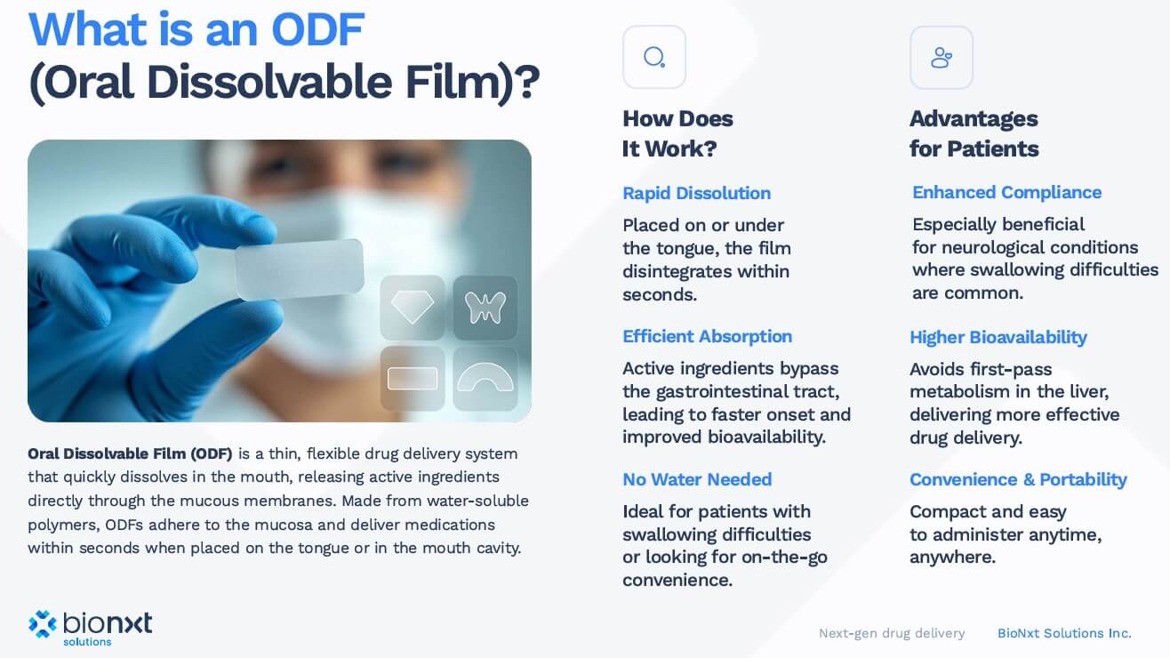 BioNxt Solutions konzentriert sich mithilfe der firmeneigenen Plattform auf die Verbesserungen bei den Anwendungen von Medikamenten gegen Autoimmunerkrankungen wie auch neurologische Störungen. Besonders Patienten mit Schluckbeschwerden (Dysphagie) sind Zielklienten des Unternehmens, denn die Entwicklung erleichtert die bisher problematische Medikamentenaufnahme bei den betroffenen Patienten deutlich. Zur Anwendung kommt dabei das eigenentwickelte sublinguale Cladribin-Produkt, das über die Mundschleimhaut aufgenommen wird. Dieser Wirkstoff verzichtet auf die übliche Verabreichungsform von Tabletten und bietet darüber hinaus den Vorteil einer verbesserten Wirkstoffaufnahme gerade bei Multipler Sklerose (MS) Patienten. An MS leiden weltweit ca. 2,3 Mio. Menschen und Unternehmen wie Merck KGaA erzielen mit ihren Tabletten Jahresumsätze von 1 Mrd. EUR und mehr. Doch gerade MS Patienten leiden unter Schluckbeschwerden und die Innovation von BioNxt Solutions kann dieses gravierende Problem lösen. Bioäquivalenzstudien am Menschen sollen bestätigen, dass die Wirkstoffe viel schneller über die Mundschleimhaut aufgenommen werden können.