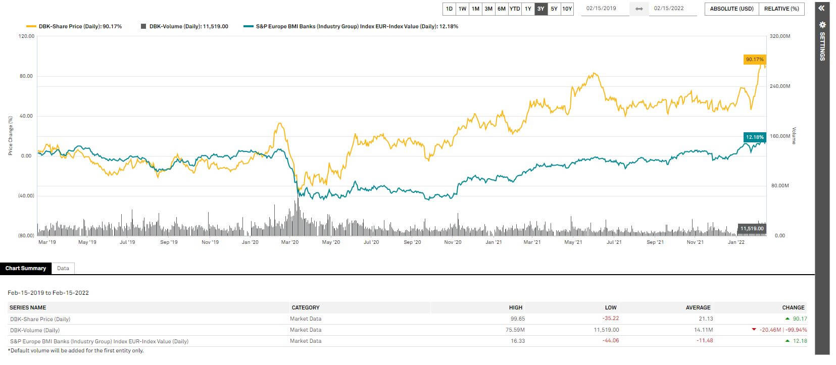 Der dreijährige Kursverlauf der Deutschen Bank-Aktie verdeutlicht die positive Entwicklung im Vergleich zum europäischen Banking-Sektor seit Beginn der Corona-Pandemie im März 2020. Die anfangs zähen Fortschritte zur Transformation des Konzerns trugen in den letzten 12 Monaten nun endlich ihre Früchte. Gegenüber der Benchmark konnte eine Outperformance des Aktienkurses von 78% erzielt werden. Das gelang den wenigsten Branchenvertretern, die alle ihrerseits mit den Pandemie-Bedingungen zurechtkommen müssen. Die Deutsche Bank ist in ihrer Entwicklung schon sehr weit fortgeschritten und für die jetzt eingeläutete Zinswende gut aufgestellt.