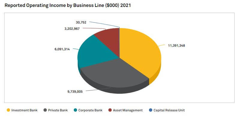 Die operativen Umsatzanteile in den Geschäftsbereichen überschritten im Bereich Investment-Banking die 11 Mrd. EUR-Grenze, dicht gefolgt vom Bereich der Privatkunden mit 9,7 Mrd. EUR. Der Sektor Unternehmenskunden steuerte 6,1 Mrd. EUR bei, im Bereich Asset Management wurden 3,2 Mrd. EUR umgesetzt. Auf Konzernebene summierten sich die unbereinigten Gesamterlöse auf 30,0 Mrd. EUR. und verteilten sich wie folgt: