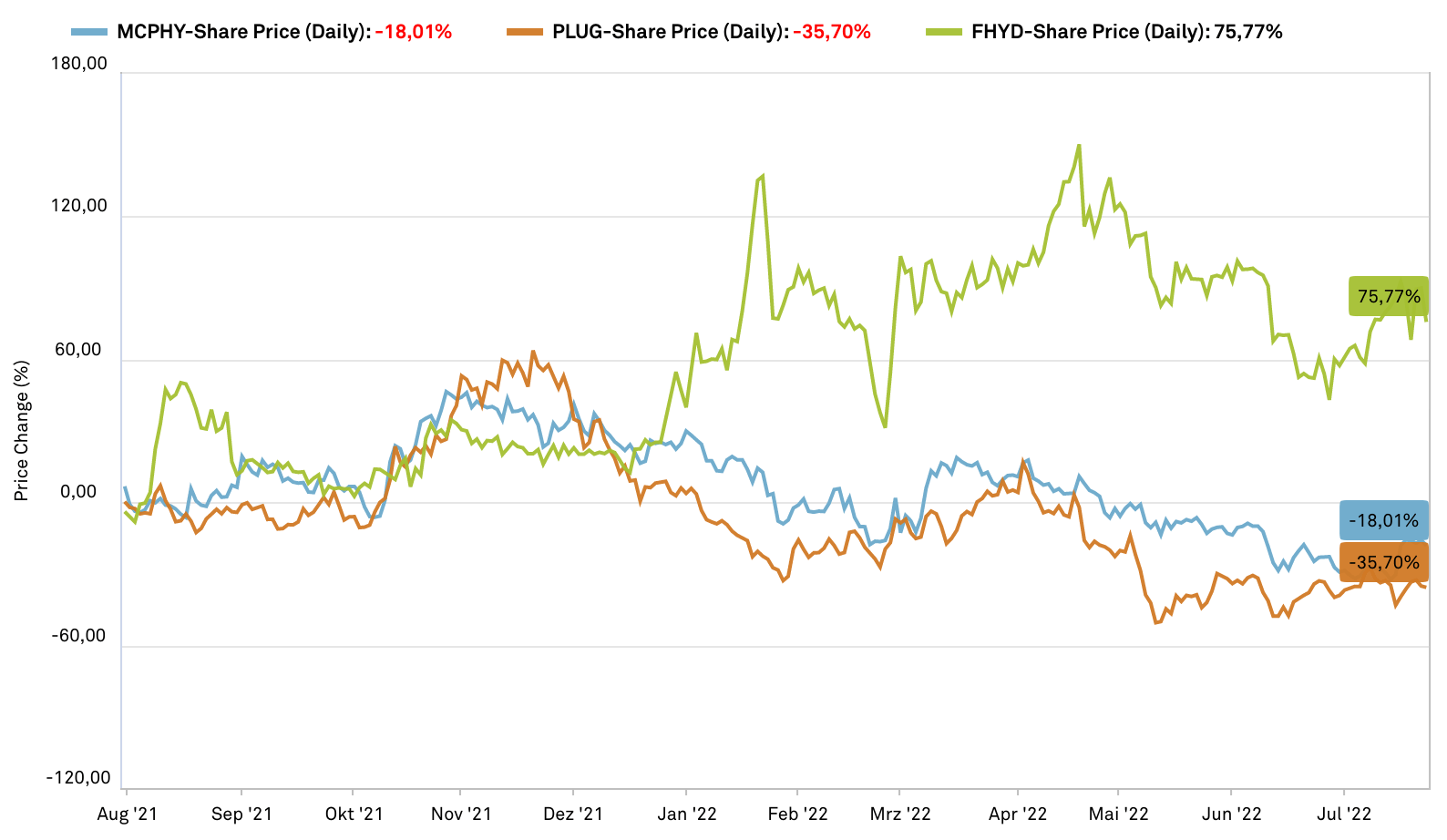 McPhy Energy kommt im Peer-Group-Vergleich First Hydrogen am Nächsten. Der Börsenwert der Franzosen, die sich ebenfalls auf Anlagen zur Produktion und Distribution von Wasserstoff fokussieren, liegt bei 424,20 Mio. EUR, rund viermal so hoch wie die Marktkapitalisierung der Kanadier. Laut S&P CapitalIQ Pro erreichte McPhy 2021 einen Umsatz von 13,13 Mio. EUR, der Nettoverlust lag bei 23,57 Mio. EUR. Die hohe Bewertung wird neben der Marktführerschaft mit dem geplanten Wachstum begründet. Demnach erwarten die Analysten für 2022 Umsätze in Höhe von 19,30 Mio. EUR, 2023 von 38,80 Mio. EUR und 2024 geschätzte 82,72 Mio. EUR. Somit beträgt das Kurs-Umsatzverhältnis auf Basis des Jahres 2022 hohe 32,31.