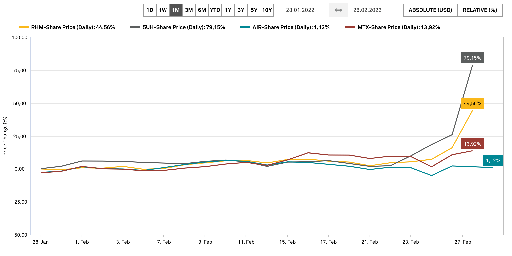 Die aktuell zu eskalieren drohende Ukraine-Krise treibt vor allem die Kurse der Rüstungsunternehmen hoch. Mit der Regierungserklärung durch Bundeskanzler Olaf und der Erhöhung der Ausgaben für die Bundeswehr in Höhe von 100 Mrd. EUR kam es bei Rheinmetall gestern zu einem Kursanstieg von mehr als 27% auf 138,70 EUR und dem Erreichen eines neuen Allzeit-Hochs. Dass Rheinmetall als führendes deutsches Systemhaus profitieren wird, steht außer Frage.