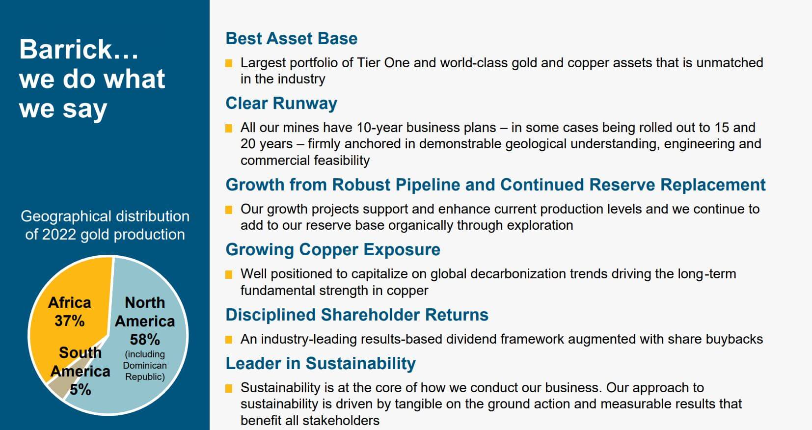 Barricks Prognose für die Förderung von Gold beträgt 4,2 bis 4,6 Mrd. Unzen respektive 420 bis 470 Mio. Pfund Kupfer. Die Inputkosten werden für 2023 in unveränderter Höhe erwartet. Wichtig ist dem Management die Transformation des Energiebedarfs in eine nachhaltige Dimension. Diese Umstellungen werden Kosten aufwerfen, sind aber eine Voraussetzung für die grüne Ausrichtung des Bergbaukonzerns. Weltweit investierende Fonds achten stark auf die Einhaltung der ESG-Kriterien und der ständigen Fortentwicklung in Richtung Nachhaltigkeit. In einer seiner größten Minen Loulo-Gounkoto wurde eine Solaranlage installiert, welche den CO2-Ausstoß um 62.000 Tonnen pro Jahr verringert - ein willkommener Schritt!