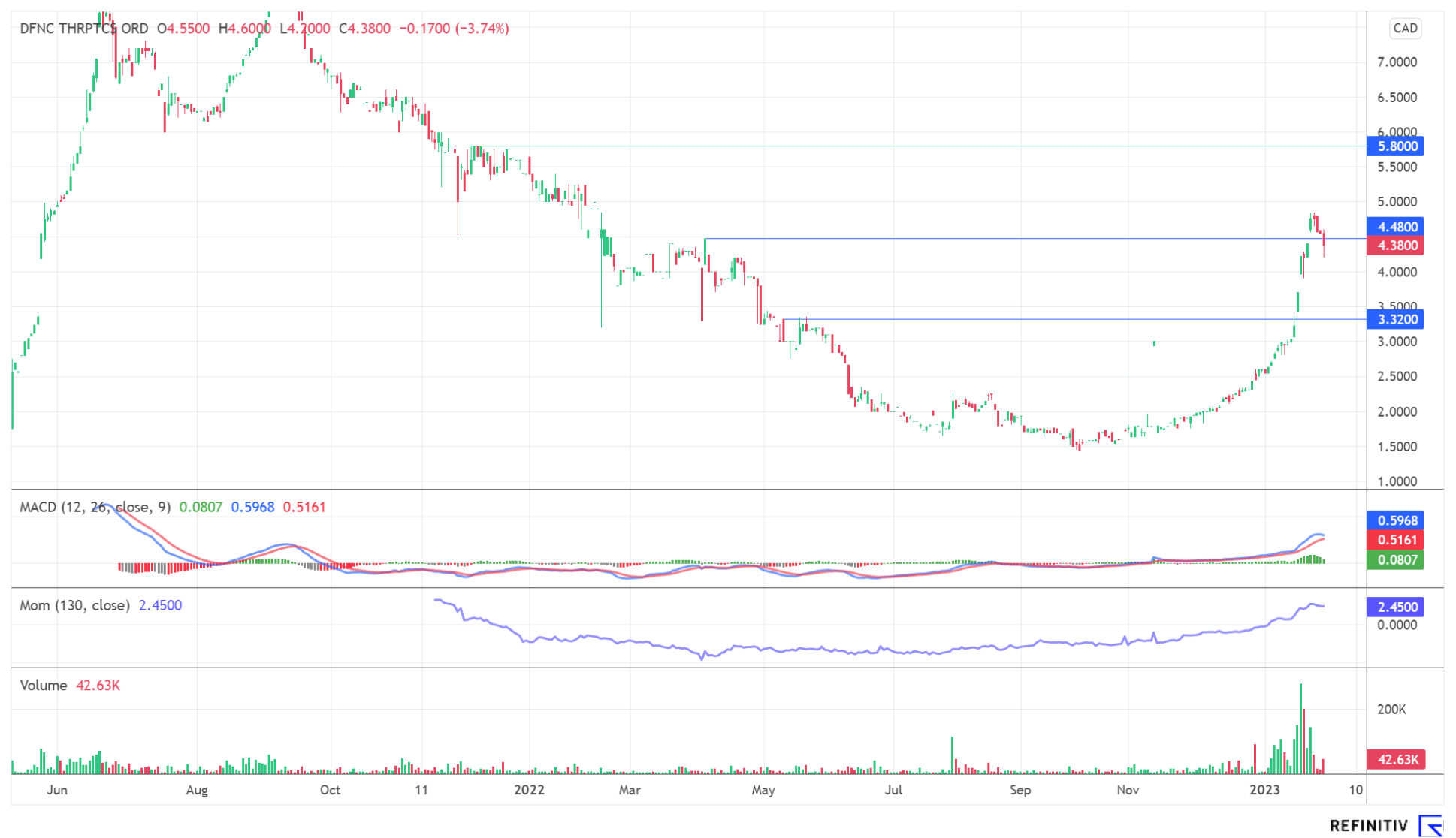 Die Aktie von Defence Therapeutics entwickelte sich während der vergangenen Wochen überaus dynamisch und zeigt nach Kursgewinnen von rund 50% in wenigen Wochen eine große relative Stärke. Die aktuelle Konsolidierung kann bei weiterem Newsflow als Sprungbrett für Kursgewinne dienen. Der Verlaufschart der Aktie weist kurzfristig Potenzial bis 5,80 CAD aus. Selbst neue Rekord-Hochs jenseits der Marke von 8 CAD sind – Rückenwind aus der Branche vorausgesetzt - möglich.
