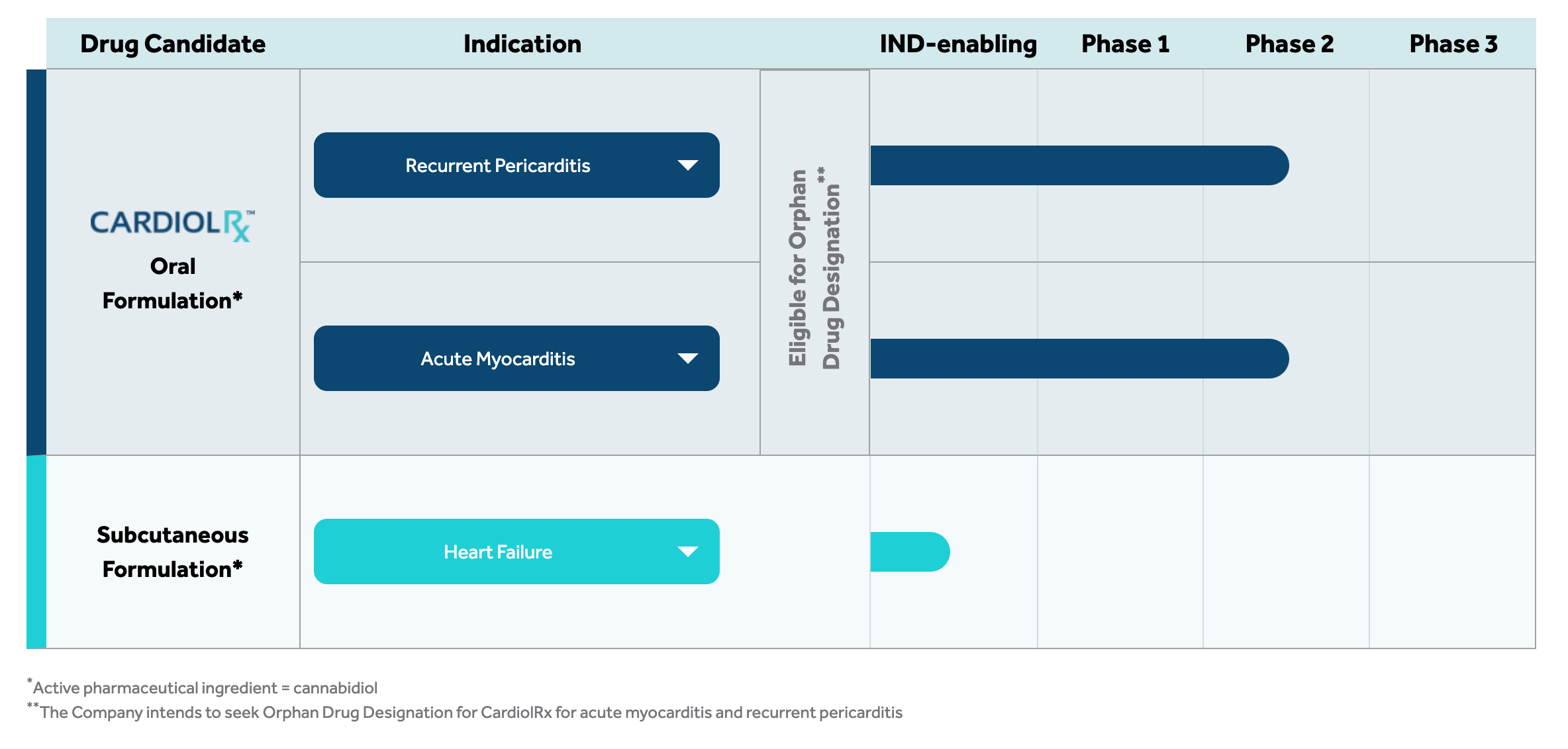 Schon 2022 präsentieren Cardiols Forscherkollegen der Virginia Commonwealth University Ergebnisse, die die schützende Wirkung von CardiolRx™ in einem Modell der Perikarditis belegen. Cardiol wurde gegründet, um die entzündungshemmenden und antifibrotischen Eigenschaften von Cannabidiol in neue therapeutische Lösungen zu überführen und so Menschen mit Herzerkrankungen zu unterstützen. Darüber hinaus entwickelt Cardiol auch eine neuartige, subkutan verabreichte Arzneimittelformulierung von Cannabidiol, die für den Einsatz bei Herzinsuffizienz vorgesehen ist - eine führende Ursache für Tod und Krankenhausaufenthalte in den Industrieländern, wobei die damit verbundenen Gesundheitskosten in den USA jährlich 27,8 Mrd. EUR übersteigen. Nach der Phase-II-Studie folgen in der Entwicklungs-Pipeline Phase III - dann ist es nur noch ein verhältnismäßiger kleiner Schritt zur Kommerzialisierung. Die Möglichkeit, als Orphan Drug eingeführt zu werden, schützt vor Konkurrenzprodukten.