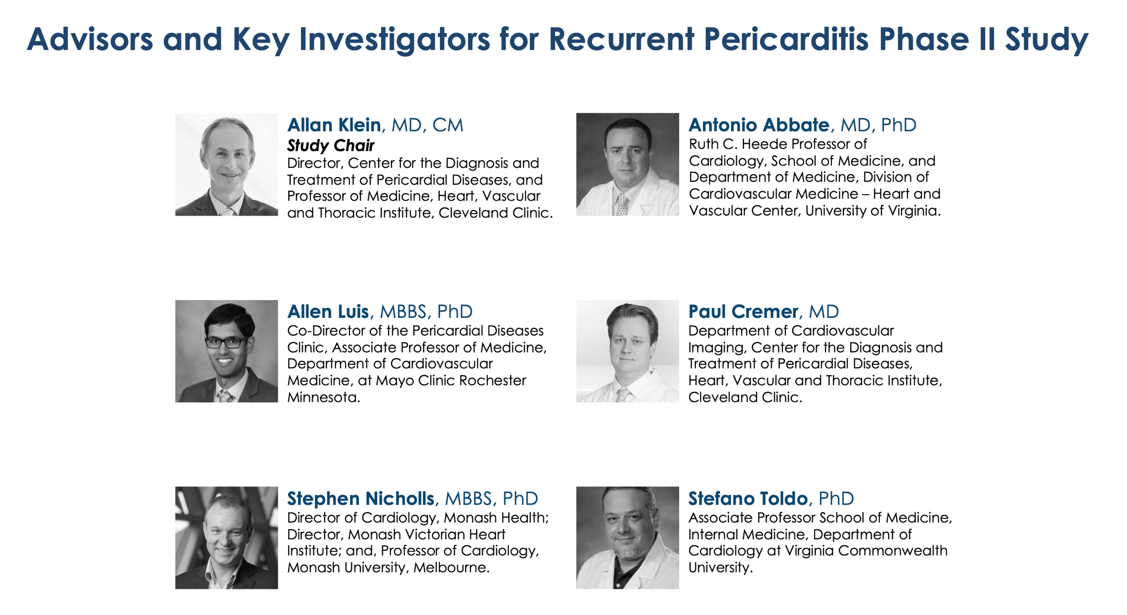 In die Phase-II-Pilotstudie werden 25 Patienten in klinischen Zentren in den USA aufgenommen, die auf die Behandlung von Perikarditis spezialisiert sind. Diese Studienphase erforscht die therapeutische Wirkung. Das Protokoll wurde in Zusammenarbeit mit führenden Experten auf dem Gebiet der Perikarderkrankungen entwickelt. Studienleiter ist Allan L. Klein, MD, Direktor des Zentrums für Herzbeutelerkrankungen und Professor für Medizin am Herz- und Gefäßinstitut der Cleveland Clinic.