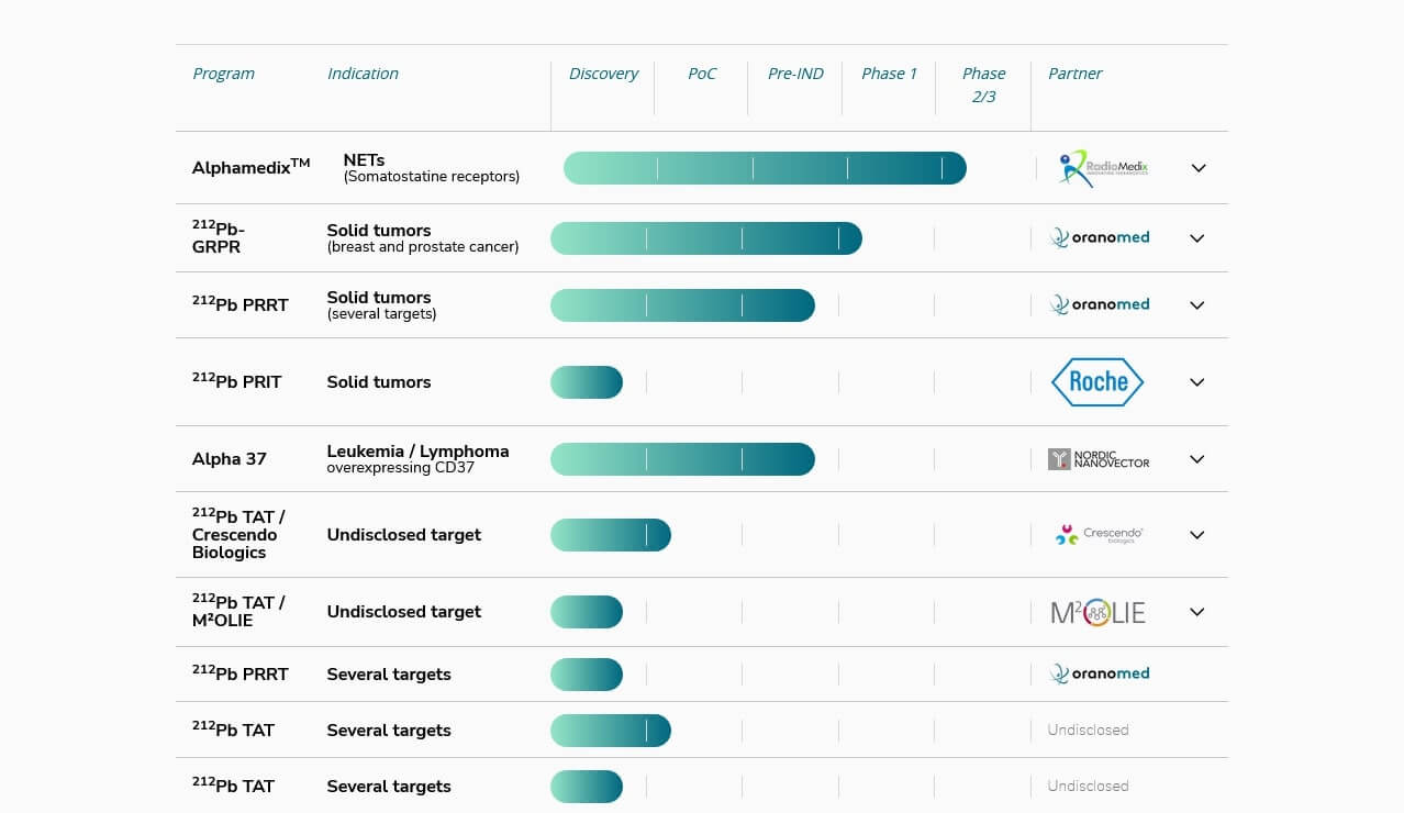 Orano ist 2001 aus dem französischen Atom-Konzern Areva hervorgegangen und hat sich im Bereich der Nuklearmedizin einen Namen gemacht. Bereits 2005 entwickelte das Unternehmen einen Prozess, um das Radioisotop von Blei, Blei-212, herzustellen. Der Stoff ist für innovative Krebstherapien essenziell und spielt rund um die Targeted Alpha Therapy (TAT) eine zentrale Rolle. Nach mehreren klinischen Studien rund um Blei-212 als Therapeutikum investierte Orano in Produktionsstätten für den seltenen Stoff und verfügt auch über eine Niederlassung in den USA. „Orano Med hat sich zum Ziel gesetzt, ein solides Portfolio von Krebstherapien zu entwickeln, das die Eigenschaften von Blei-212 mit denen von Targeting-Vektoren kombiniert. Zu diesem Zweck sind ein Dutzend Entwicklungen im Gange, entweder zu 100 % von Orano Med oder in Partnerschaft mit anderen Biotechnologie- oder Pharmaunternehmen in Frankreich und international", schreibt Orano auf seiner Webseite. Zu den Partnern von Orano gehört unter anderem Roche.