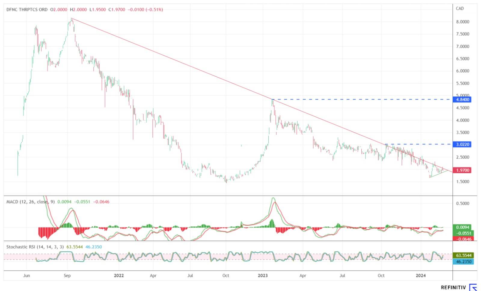 Angesichts des breiten Anwendungsspektrums von Accum™, der neuen Erkenntnisse zum Chemotherapeutikum AccuTOX™, das vorm klinischen Zulassungsverfahren steht und der aktuell moderaten Bewertung von rund 87 Mio. CAD, ist die Aktie ein Comeback-Kandidat in den Startlöchern. Selbst ein Übernahmeangebot eines großen Players kann nicht ausgeschlossen werden – große Konzerne könnten die weiteren Aktivitäten von Defence locker finanzieren und erhielten im Gegenzug ein flexibles Multi-Tool rund um die Themen Krebstherapie, mRNA und Vakzine. Auch markttechnisch zeigt sich Potenzial: Jenseits der Marke von 2 CAD könnte die Aktie Fahrt aufnehmen und den Abwärtstrend verlassen. Spekulativ denkende Investoren sollten sich den Wert vormerken.