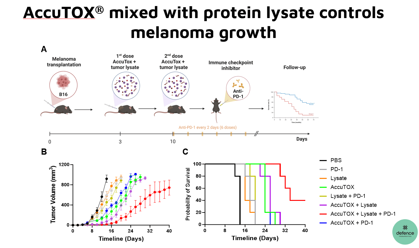 Gegenüber der Technologie in einem früheren Stadium, soll AccuTOX™ jetzt nur noch rund ein Zehntel des Proteins benötigen, um eine Immunreaktion auszulösen. Das hat gleich mehrere Vorteile: Erstens sinkt die Gefahr von unerwünschten Reaktionen, zweitens dürften Kosten geringer ausfallen. Defence Therapeutics konnte zudem zeigen, dass die Kombination aus AccuTOX™ und einem Antigen (Tumor Lysate) zu einem langsameren Wachstum von Melanomen in Mäusen und höheren Überlebensraten führt. Insgesamt zeigen die neuesten Erkenntnisse, dass AccuTOX™ 48 verbesserte Eigenschaften gegen Krebs aufweist und gleichzeitig sämtliche positiven Eigenschaften des ursprünglichen Accum™-Moleküls behält. Hinzu kommt die synergistische Wirkung mit Immun-Checkpoint-Inhibitoren, was die Technologie äußerst flexibel und damit mit anderen Lösungen kombinierbar macht – allesamt Eigenschaften, die aufhorchen lassen.