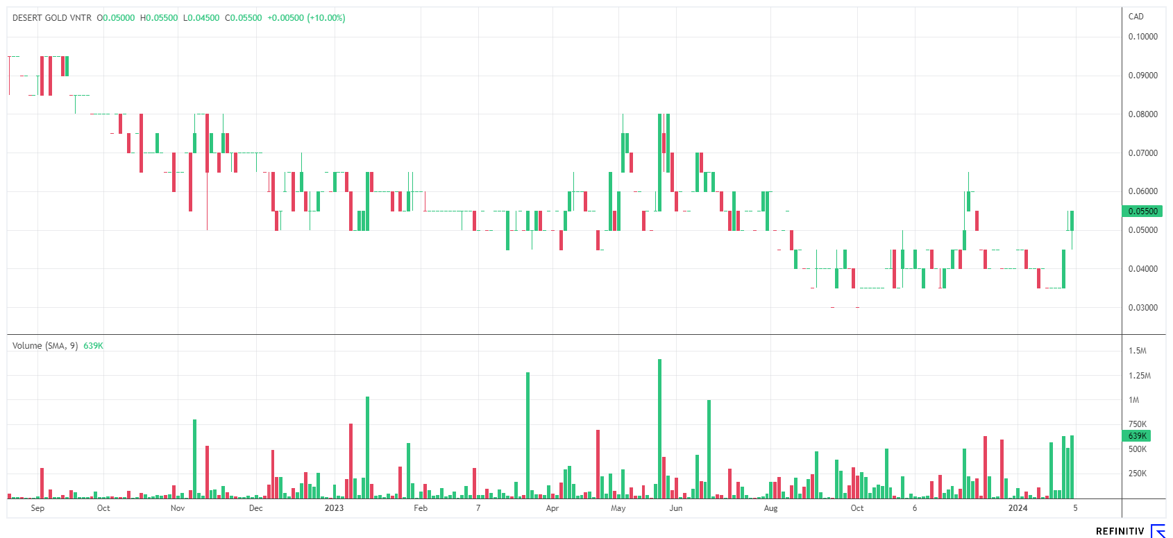 Sollten die ersten Übernahme-Aktivitäten in Mali die Runde machen, werden afrikanische Junior-Explorer sehr schnell in den Fokus der Anleger geraten und spekulativ überproportional zulegen können. Mit einer demnächst verfügbaren Machbarkeitsstudie (PEA) verringert sich das Risiko in dem Projekt erheblich, denn mit jeder weiteren Ressourcen-Ausdehnung erhöht sich der potenzielle Übernahmepreis, wenn es zu einem Deal kommen sollte. Nach der laufenden Platzierung sollte es längere Zeit keine weitere Verwässerung geben, denn ab 2025 wird der erste Cashflow erwartet. Das Volumen in der Aktie stieg mit höheren Preisen zuletzt deutlich an. Richtig spannend wird es, wenn das Hoch von 2023 bei ca. 0,11 CAD überwunden werden kann. Günstiger wie 0,06 CAD wird man die Desert Gold-Aktie aus heutiger Sicht wohl nicht mehr bekommen.