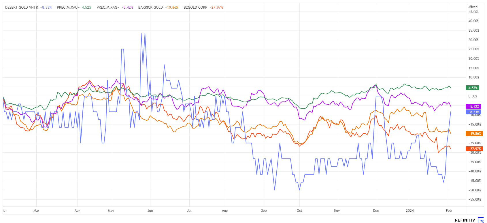 Die Desert Gold-Aktie ist nach einem langen Seitwärtstrend in 2023 relativ gut ins neue Jahr gestartet. Aktuell läuft gerade eine Privatplatzierung zu 0,07 CAD. Die ersten Ankerinvestoren waren wegen der guten Aussichten sogar bereit, einen kleinen Aufschlag zum aktuellen Preis von 0,06 CAD zu bezahlen. Die Belohnung liegt auch in der Zuteilung eines Optionsscheins mit Basis von 0,08 CAD und einer Laufzeit von 3 Jahren. Insgesamt sollen bis zu 10 Mio. Aktien platziert werden. CEO Jared Scharf geht aber davon aus, dass weiteres Interesse von Großanlegern besteht, die sich auch in einem strategischen Rahmen von bis zu 10 % engagieren könnten. Charttechnisch kann Desert Gold derzeit eine starke Aufholjagd zu seiner großen Peergroup in Mali zeigen. Obwohl noch alle Titel im Minus liegen, hat die kleine Desert Gold bereits ordentlich Boden gutmachen können.