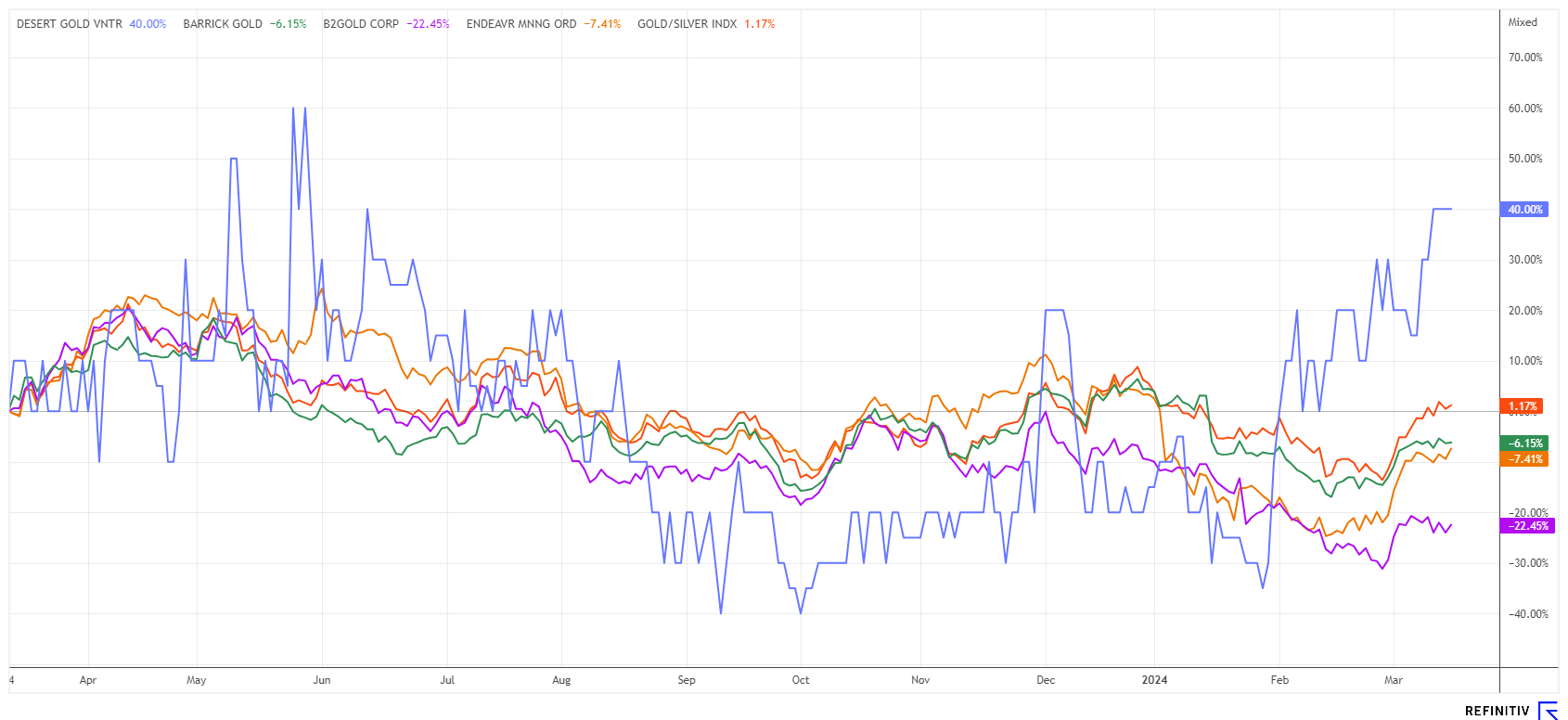 Die Desert Gold-Aktie macht wieder Spaß. Die guten News aus der Privatplatzierung bei 0,07 CAD lassen erwarten, dass der Preis in den nächsten Wochen über diese Marke steigen wird. Denn die Besitzer von Optionsscheinen mit einer Basis von 0,08 CAD werden recht schnell in die Aktie wechseln, um von der erwarteten Aufwertung zu profitieren. CEO Jared Scharf geht aber davon aus, dass weitere Großanleger auf den kleinen kanadischen Wert aufmerksam werden. Erhält man doch für eine wirklich niedrige Bewertung alle Möglichkeiten der nächsten Konsolidierungsrunde ins Depot gebucht. Die Größenunterschiede der ansässigen Bergbaugesellschaften macht eine Integration von Desert Gold zu einem bestimmten Zeitpunkt der Ressourcenbestimmung höchst wahrscheinlich. Denn während die angrenzenden Konzerne wie Barrick Gold (25,4 Mrd. EUR), B2Gold (3,17 Mrd. EUR) und Allied Gold (578 Mio. EUR) bereits über ordentliche Marktbewertungen verfügen, kommen die Kanadier mit der neuen Aktienzahl gerade mal auf rund 10 Mio. EUR.