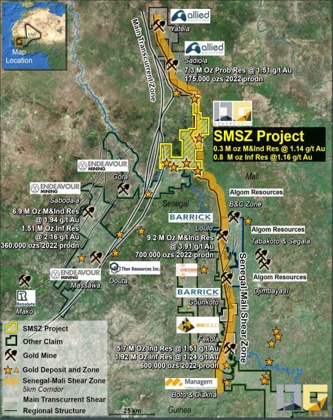 Die aussichtsreiche Landfläche des SMSZ-Projekts an der Grenze von Mali und Senegal erstreckt sich über 440 km² und befindet sich in der Senegal-Mali-Scherzone. Die Produktion von Gold ist für das westafrikanische Land Mali eine der größten und beständigsten Einnahmequellen. An der Grenze zum Nachbarland Senegal befindet sich der bekannte Loulo-Gounkoto-Komplex, wo sich eine der größten Goldvorkommen der Welt befinden. In den vergangenen 12 Monaten wurde durch die dortige Goldproduktion mehr als 1 Mrd. USD zur malischen Wirtschaft beigetragen. Neben der noch jungen Desert Gold befinden sich bereits die produzierenden Minen von Barrick und Allied Gold, Endeavour Mining und B2Gold vor Ort. Unweit nördlich der Desert-Liegenschaften befinden sich die historisch erfolgreichen und nun reaktivierten Bezirke Yatela und Sadiola. Sie sind seit 2021 im Mehrheitsbesitz von Allied Gold und haben historisch bereits 6,8 Mio. Unzen Gold produziert. IAM Gold verkaufte 80 % der Sadiola Mine an den neuen Produzenten Allied Gold. Sie wird in den nächsten Jahren zu einer der größten, reaktivierten Minen Malis ausgebaut.