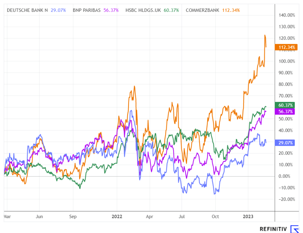 Seit unserer Erstanalyse vom Februar 2022 hat sich fundamental sehr viel getan. Mit der Verdoppelung des Nettogewinns auf 5,7 Mrd. EUR erreichte die Kernkapitalquote im letzten Jahr hohe 13,4%. Ausgehend von einem 52-Wochen-Tief bei 7,25 EUR im Oktober 2022 konnte der Kurs bereits um knapp 70% ansteigen, das ist einer der besten Kursentwicklungen im DAX 40. Dennoch ist die Bank im internationalen Vergleich sehr niedrig bewertet. Mit einer Marktkapitalisierung von aktuell 24,2 Mrd. EUR ist die Deutsche Bank im internationalen Größenvergleich weit abgeschlagen und in Europa nur auf Platz 11 zu finden.