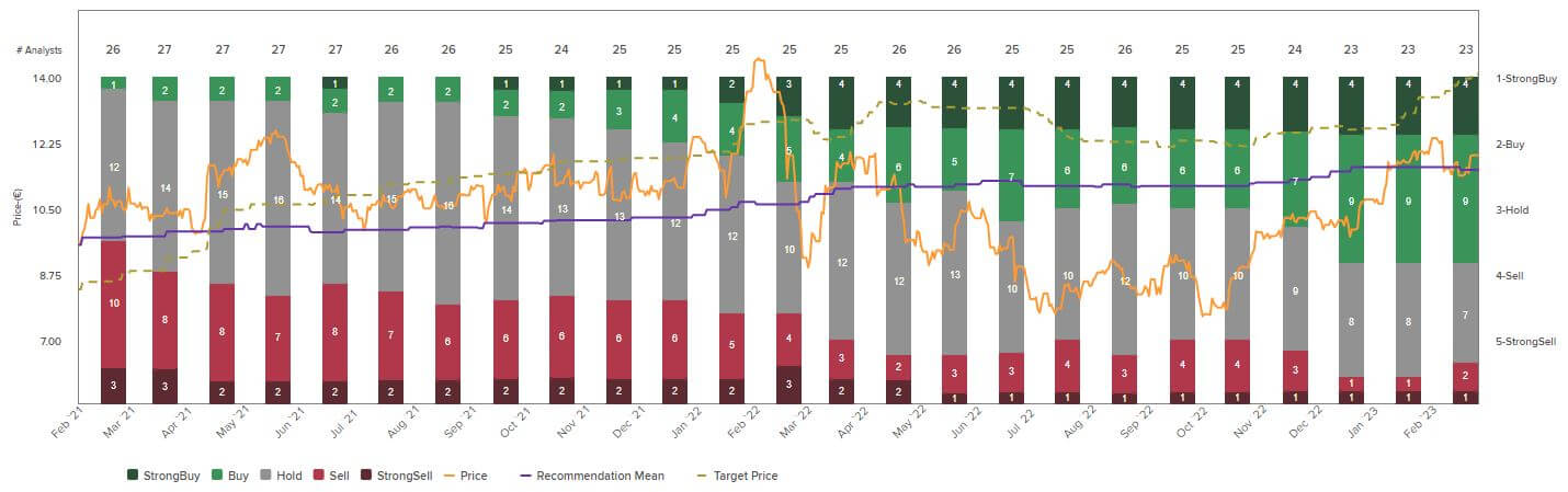 Der Bewertungsabschlag zur Peergroup ist aktuell immer noch zu groß. Dennoch verbessert sich die Empfehlungsquote der Analysten seit einem Jahr sukzessive. Mittlerweile haben die Analysehäuser ihre Einschätzungen nach oben angepasst und erwarten im Schnitt ein Kursziel von über 14 EUR auf Sicht von 12 Monaten.