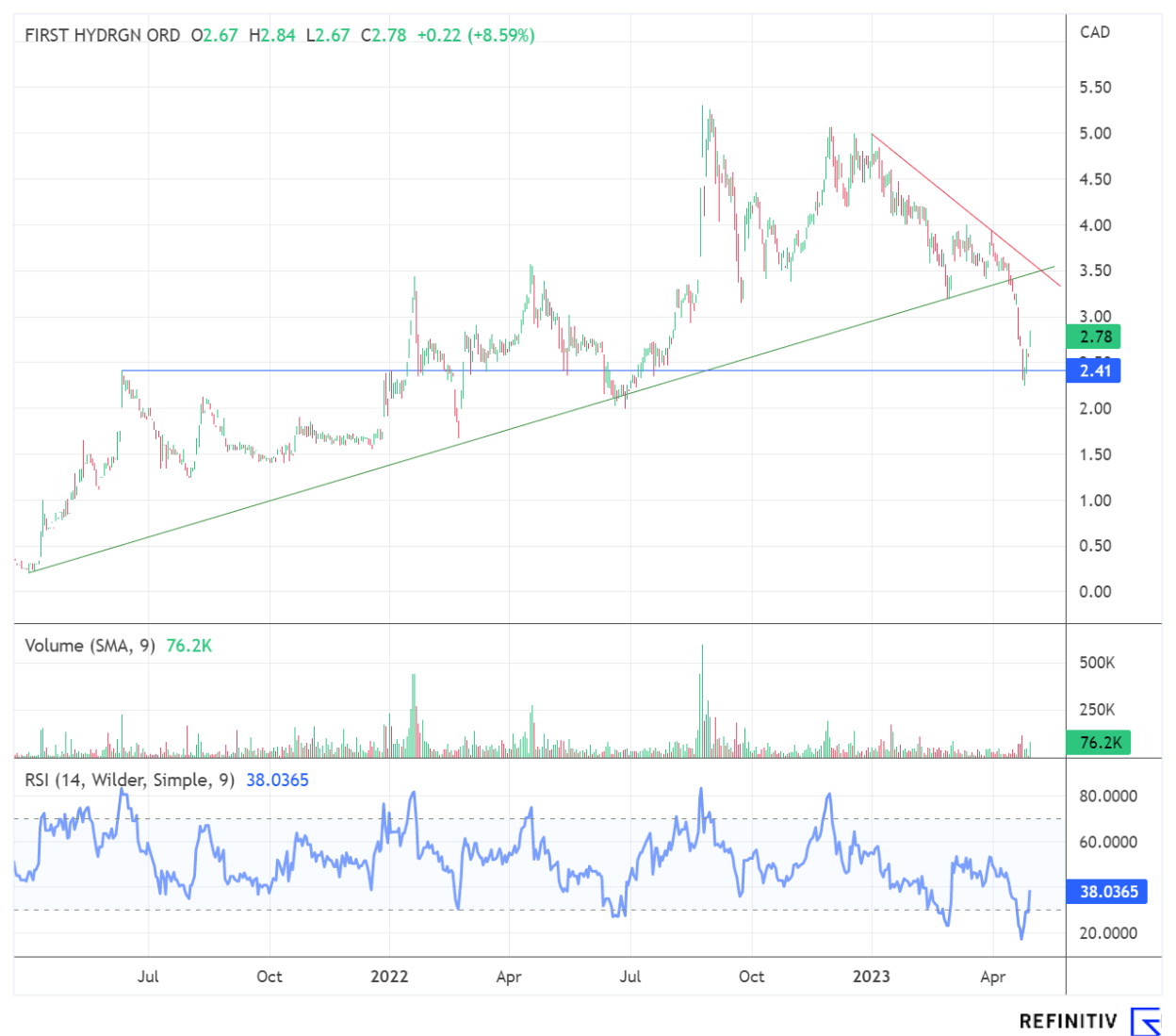 Die positive Geschäftsentwicklung spiegelt sich im Chart des Wasserstoffspezialisten aktuell nicht wider, ganz im Gegenteil. Durch den branchenweiten Ausverkauf und Kurshalbierungen von Global Playern wie Plug Power, Nel Asa oder Ballard Power, wurde die Aktie der Kanadier nach einer deutlichen Outperformance in den letzten Monaten in Sippenhaft genommen und verlor seit Anfang April im Tief bis zu 43 % ihres Wertes. Durch den Bruch des seit März 2021 etablierten Aufwärtstrends kam es zu einem regelrechten Ausverkauf unter erhöhtem Volumen. Dabei konnte der Kurs das Hoch des Jahres 2021 bei 2,41 CAD erfolgreich verteidigen und dürfte durch die überverkaufte Lage, wie am RSI ersichtlich, das Potenzial besitzen, zumindest bis zum seit Januar 2023 kurzfristig ausgebildeten Aufwärtstrend bei aktuell 3,59 CAD heranzureichen. Höhere Kurse sind selbstredend möglich, sollte sich die Nachrichtenlage im Hinblick auf erfolgreiche Testreihen des Prototyps sowie dem Aufbau der geplanten Wertschöpfungskette im Wasserstoffsektor weiterhin positiv gestalten.
