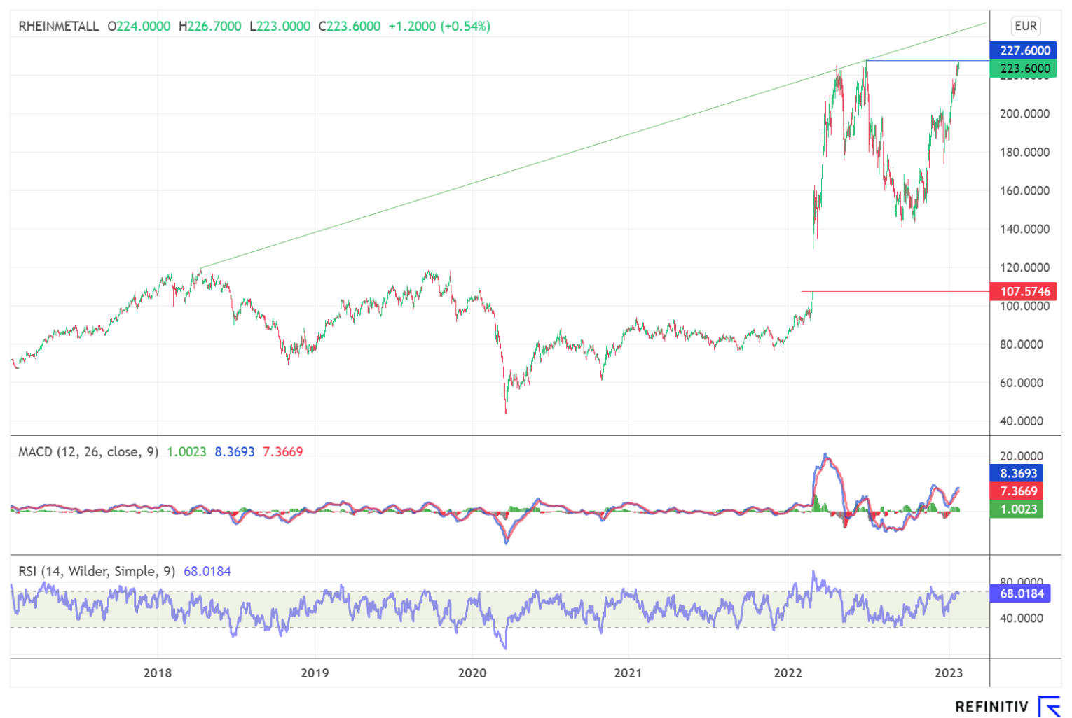 Die positive Auftragslage sowie das weiterhin positive Sentiment für Rüstungsunternehmen spiegelt sich im Aktienchart der Düsseldorfer wider. Seit dem Beginn der Invasion legte der Kurs um knapp 150% zu und steht erneut kurz vor dem Erreichen eines neuen Allzeithochs. Ein Marsch durch die Frontlinie bei 227,90 EUR würde ein Vorrücken bis zum seit April 2018 ausgebildeten Aufwärtstrend bei aktuell 246,50 EUR generieren. Sollte auch dieser überwunden werden, ist ein weiterer Gang bis in den 300 EUR-Bereich nicht unwahrscheinlich. Feuerschutz erhält der Kurs weiterhin von Seiten der Indikatoren. So liegt der Trendfolgeindikator MACD weiter im grünen Bereich, der Relative-Stärke-Indikator zeigt sich neutral und weist noch keine Zeichen einer Überhitzung auf.