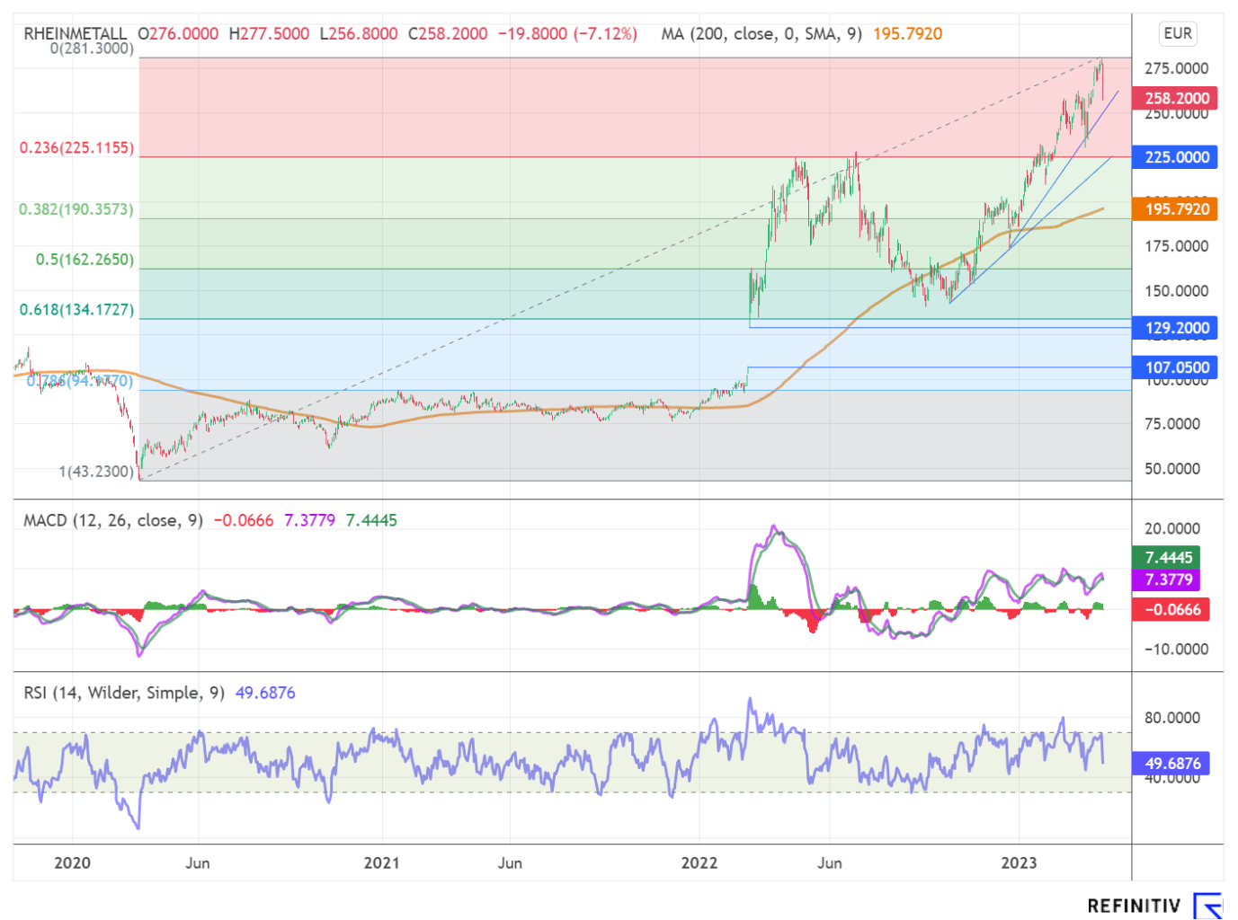 Die Rheinmetall AG hat sich seit dem Ausbruch des Ukraine-Krieges als Partner der westlichen Streitkräfte etabliert und dürfte auch weiterhin von steigenden Aufträgen durch die Deutsche Bundeswehr und seinen Nato-Partnern profitieren. Nach einem Kursanstieg von knapp 190% zeigen sich jedoch erste Risse im Chartbild des DAX-Neulings, so dass eine stärkere Korrektur nicht ausgeschlossen ist.