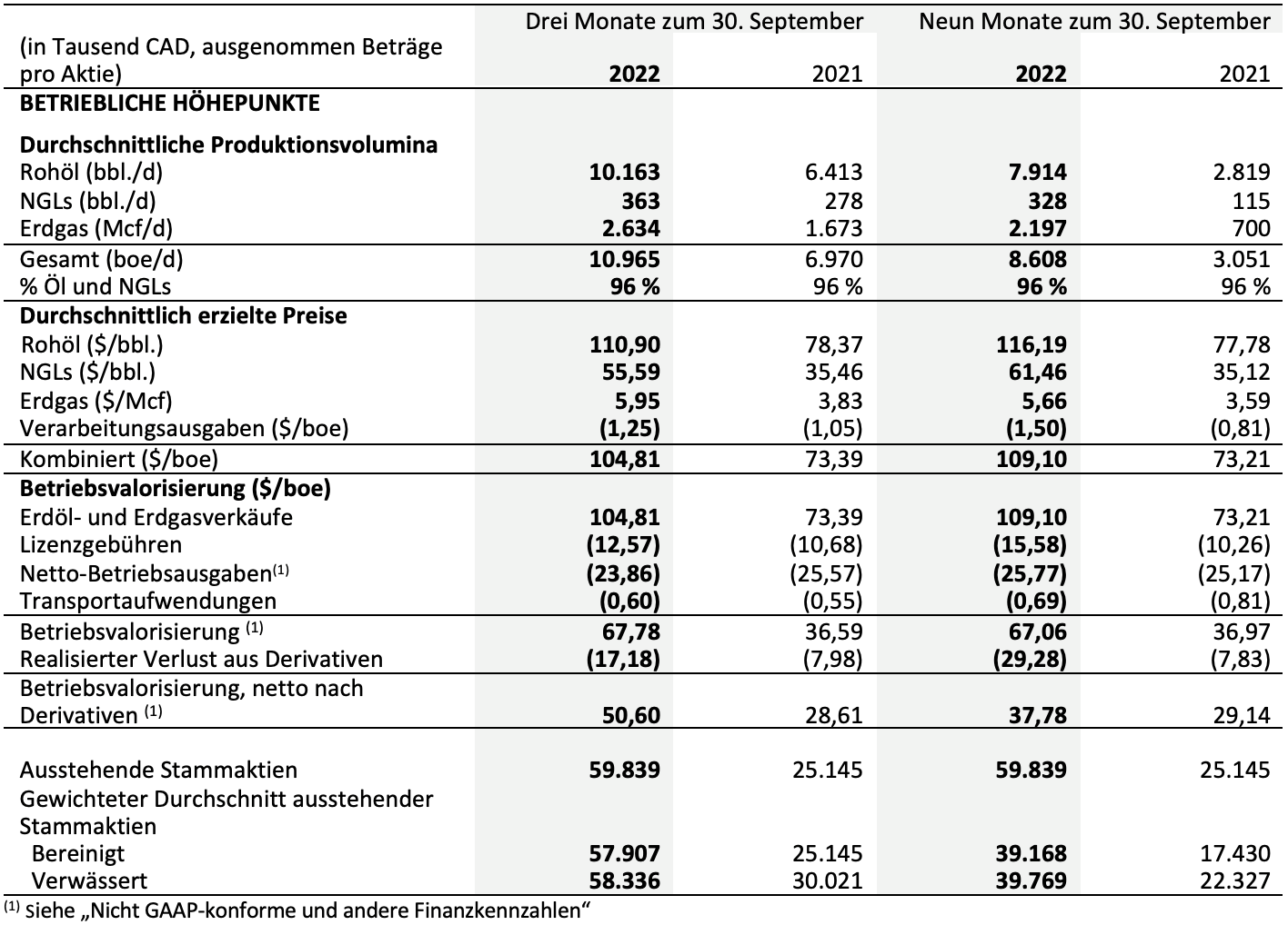 Das Highlight im 3. Quartal war für Saturn sicherlich das Closing der 240 Mio. CAD Transaktion zum Erwerb der Viking-Ölfelder in Südwest-Saskatchewan. Neben rund 200 Mio. CAD neuer Fremdkapital-Linien konnte man auch 75,2 Mio. CAD an neuem Eigenkapital einwerben. Damit sind weitere Refinanzierungsmöglichkeiten über die Ausübung von Warrants mit Bezugspreis von 3,20 CAD möglich. Theoretisch könnten somit in 2023 ff. weitere 139,7 Mio. CAD in das Unternehmen fliessen.
