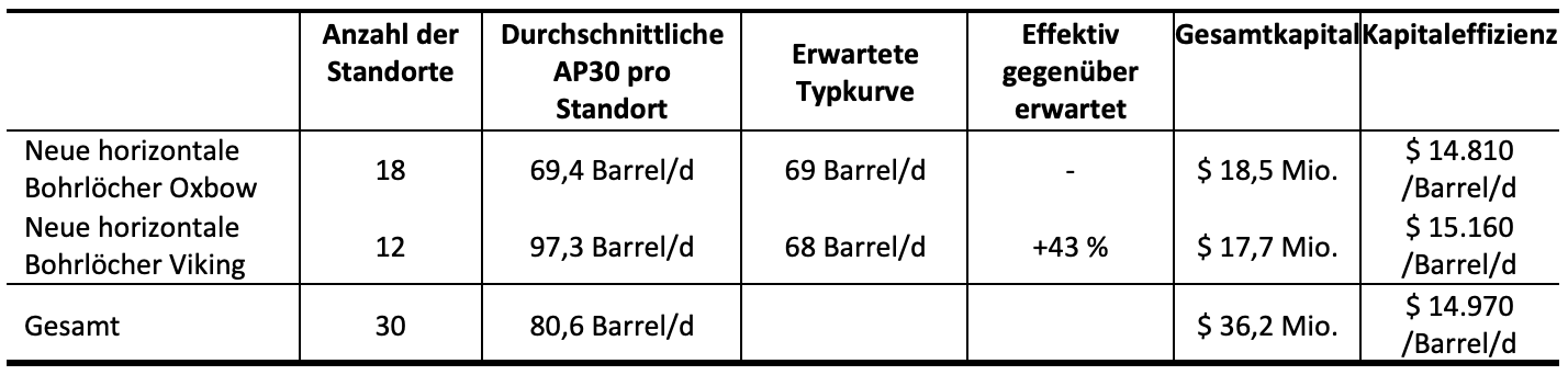 Das dritte Quartal 2022 war die aktivste Bohrperiode in der Geschichte des noch jungen Unternehmens. Saturn erschloss 29 neue horizontale Bohrlöcher für Leichtöl in den Kerngebieten Viking und Oxbow mit einer Erfolgsquote von 100%. Damit bleiben die Kanadier mit den erwarteten Produktions-Steigerungsraten auch mit den neuen Bohrlöchern auf Kurs und erzielten darüber hinaus einen markanten Erfolg bei der Erschließung der Viking-Region. Gegenüber dem letzten Jahr 2021 erhöhten sich die Erschließungskosten wegen der allgemeinen Kostendynamik zwar leicht, sie wurden aber durch stark steigende Verkaufspreise überkompensiert. Die nachfolgende Tabelle liefert eine Übersicht zur Effizienz der neu erschlossenen Liegenschaften: