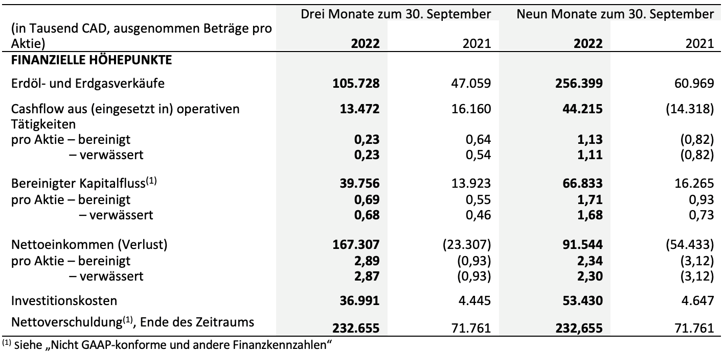 Operativ konnte Saturn im laufenden Quartal überzeugen und katapultierte die Zahlen in eine neue Dimension. Im Sommer notierten die WTI-Spotpreise zwischen 90 und 120 USD, damit konnten gut 60% der geplanten Produktion auf Termin verkauft werden. Saturn erreicht über diese Maßnahmen die geplante Entschuldung nun schon bis Mitte 2024. Die durchschnittliche Produktion erreichte 10.965 Barrel Öläquivalent pro Tag (boe/d), das ist ein Plus von 57% im Vergleich zu 6.970 boe/d im dritten Quartal 2021. Der Umsatz erreichte so die neue Rekordmarke von 105,7 nach 82,2 Mio. CAD im zweiten Quartal, im Vergleich zum Vorjahr erhöhte sich die Erlösgröße damit um ganze 124%. Auch das operative Ergebnis kann auf bereinigter Basis entsprechend stark um 179% auf 50,3 Mio. CAD zulegen. Die operative Marge im Ölverkauf entwickelte sich dynamisch auf zuletzt 67,78 CAD pro verkauftem Barrel Öl. Für die Erschließung von 30 neuen Bohrlöchern investierte das Unternehmen 36,8 Mio. CAD. Nach Abzug der Investitionen bleibt ein Mittelzufluss von 39,8 Mio. CAD in der Kasse, auf die neue Anzahl der Aktien umgerechnet liefert dies 0,69 CAD je Anteil gegenüber 0,45 CAD ein Jahr zuvor. Auf die vollverwässerte Aktie berechnet, ergibt sich unter dem Strich ein ordentlicher Nettogewinn von 2,87 CAD im Quartal, nach 9 Monaten erreicht das Unternehmen immerhin ganze 2,30 CAD. Die aktuelle Verschuldung beträgt noch ca. 235 Mio. CAD, zum Jahresende lassen sich mit heutigen Ölpreisen etwa 180 Mio. CAD prognostizieren.