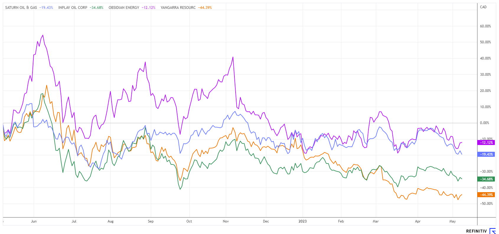 Im Chartvergleich zeigt sich ein Gleichlauf in der Branche der mittelgroßen, kanadischen Ölförderer. Dennoch konnte Saturn Oil + Gas in den letzten Wochen bei weiterhin leicht fallenden Ölpreisen im WTI von 82 auf 73 USD eine leichte Outperformance zur Peergroup erreichen.