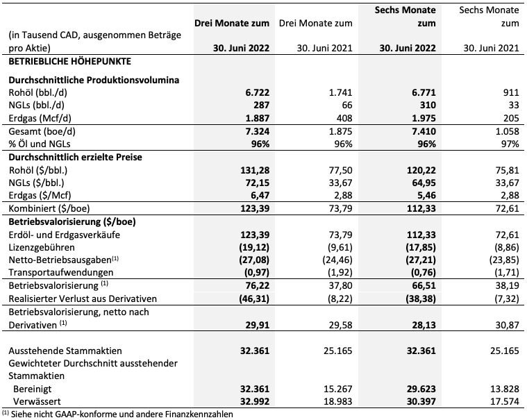 Infolge der bis dato starken Betriebsergebnisse, wird die oben genannte Prognose des Unternehmens bekräftigt, wonach sich die durchschnittliche Produktion im vierten Quartal 2022 voraussichtlich auf 12.300 bis 12.700 boe/d belaufen wird. Die aktuelle Produktion nach dem Abschluss des Viking-Erwerbs liegt bei über 11.000 boe/d, basierend auf Schätzungen vor Ort. Die im Juli nun final abgeschlossene Transaktion hebt die zuletzt geänderte Prognose für den bereinigten Cashflow im Jahr 2023 nochmals auf 223 Mio. CAD an, was in etwa 3,98 CAD pro Aktie entspricht. Als der Preis der Sorte WTI beim Level von 110-120 USD notierte, wurden die letzten Hedging-Transaktionen durchgeführt, somit darf in den nächsten Quartalen mit Gewinnen aus den Derivate-Positionen gerechnet werden. Die Verantwortlichen hätten den Zeitpunkt kaum besser wählen können, um die wirtschaftlichen Vorteile des Viking-Geschäfts zu sichern. Das verstärkt die positive Visibilität des gänzlich neu aufgestellten Unternehmens, das in einer schwierigen Zeit auch die Forward-Verkäufe unter Dach und Fach bringen konnte.