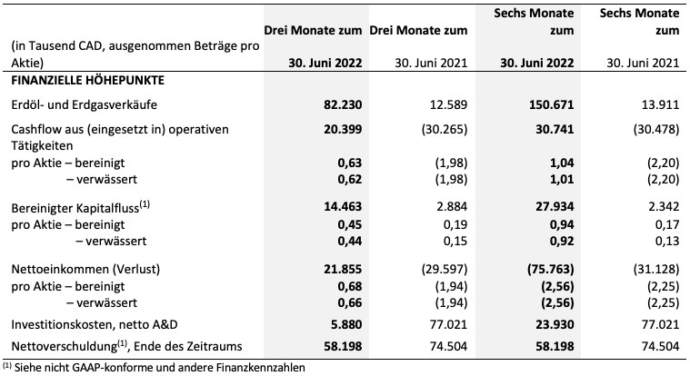 Maßgeblich kurz nach Quartalsschluss war die transitorische Übernahme der synergetischen Aktiva im Gebiet Viking, im Westen von Saskatchewan für einen Gesamtpreis von 242,6 Mio. CAD, wodurch sich die Produktion um weitere 4.000 boe/d (98 % Leichtöl und Flüssigkeiten) erhöhte. Bereits ohne diesen Neuerwerb erreichte der vierteljährliche Free-Cashflow eine Größenordnung von 8,5 Mio. CAD, welcher direkt in die Schuldentilgung floss. Mit Abschluss des Quartals lag diese bei 58,2 Mio. CAD, was einem Rückgang von 11 % gegenüber dem Vorquartal entspricht.
