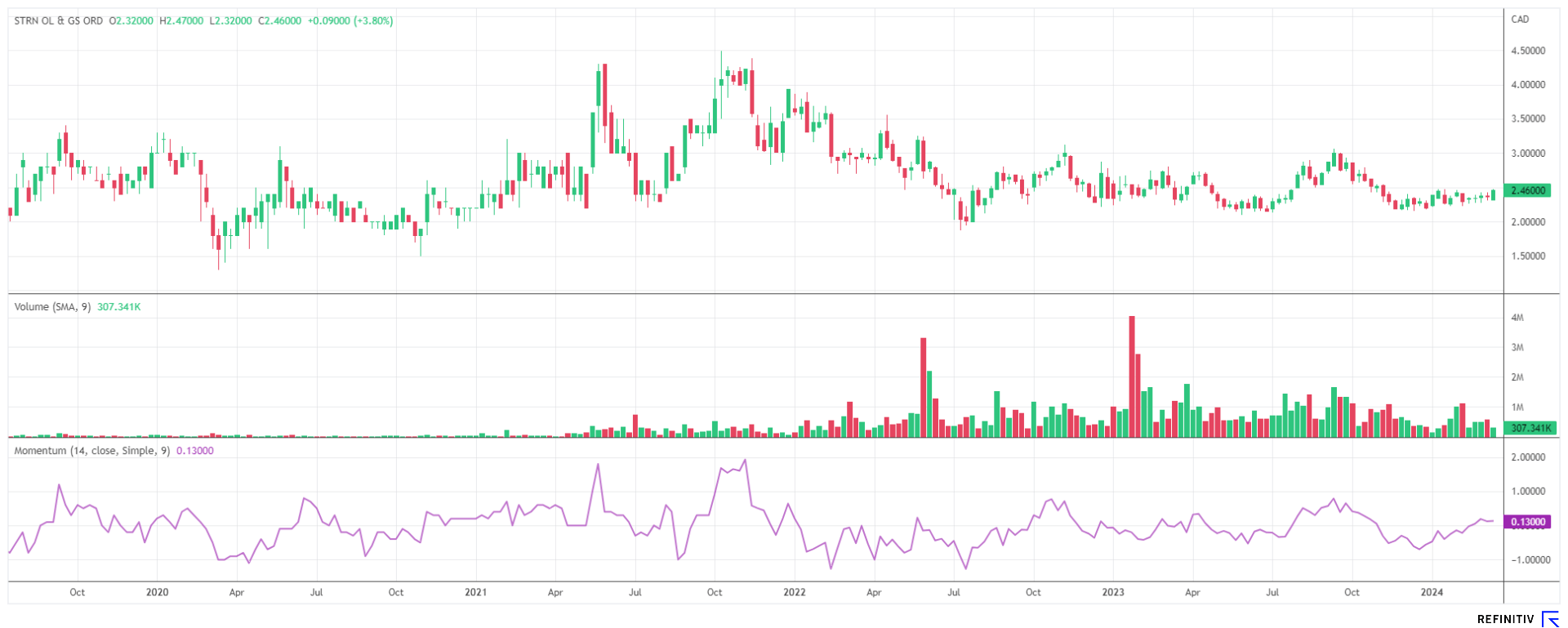 Auf Gesamtjahressicht 2023 erhöhten sich die Erlöse aus Öl- und Gasverkäufen von 368 auf 694 Mio. CAD. Die operativen Nettoerlöse erreichten 383 nach 153 Mio. CAD. Der freie Geldfluss je vollverwässerter Aktie stellte sich auf 1,14 CAD. Insgesamt verfügt Saturn per Jahresende über 278 Mio. CAD freier Mittel, welche zur Tilgung und für Neuinvestitionen eingesetzt werden können. Das vollverwässerte Ergebnis je Aktie erreicht einen Wert von 2,25 CAD, das liegt nur 10 % unter dem aktuellen Kurs von 2,44 CAD. Damit stellt sich das 2023er KGV auf einen Wert von 1,1.