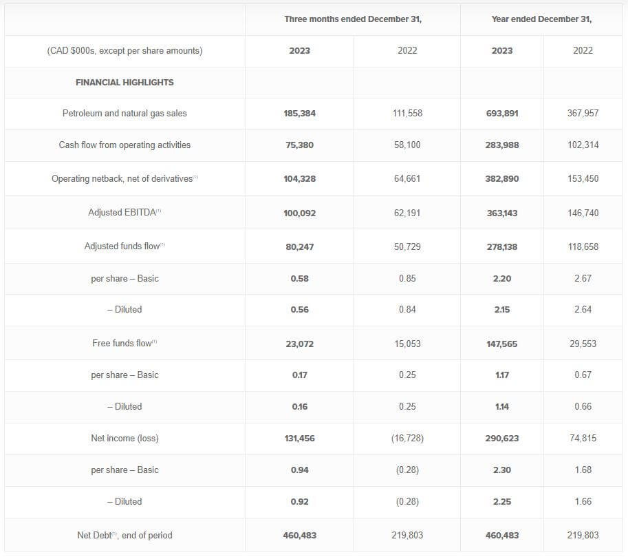 Das kanadische Rohstoffunternehmen Saturn Oil & Gas meldet eine Rekord-Produktion im vierten Quartal 2023 mit durchschnittlich 26.891 boe/d (82 % Öl und NGLs), verglichen mit 12.514 boe/d (96 % Öl und NGLs) im vierten Quartal 2022. Der Anstieg von 115 % ist auf die Übernahme der Ridgeback-Liegenschaften Mitte 2023 zurückzuführen.