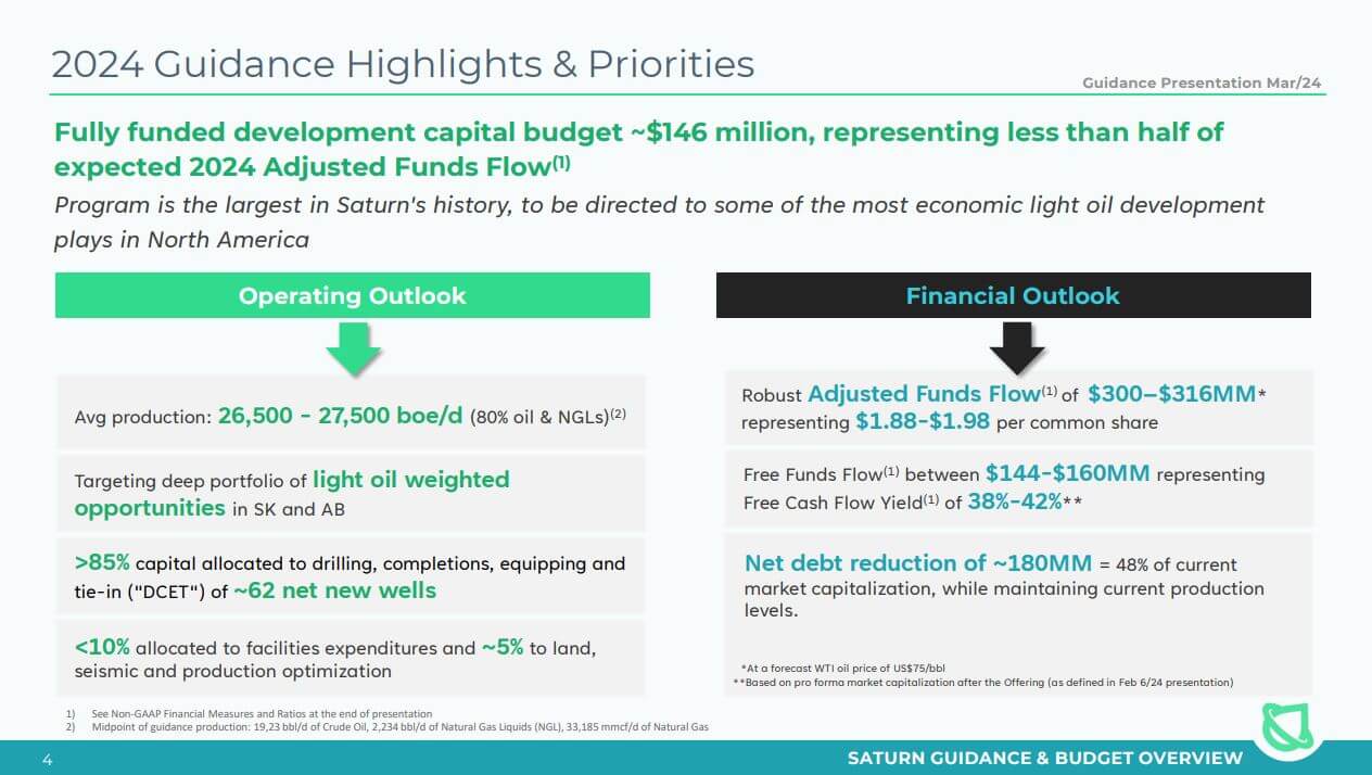 Infolge des erfolgreichen Bohrprogramms 2023 und der Übernahme von Ridgeback lag die durchschnittliche Öl- und Gasproduktion von Saturn im vierten Quartal 2023 bei ca. 26.891 BOE/Tag und die durchschnittliche Produktion erreichte im Dezember 2023 bereits ca. 28.000 BOE/Tag. Der Reservenbericht umfasst 680 Bruttobohrstandorte (576,6 netto) in Saskatchewan und 199 Bruttobohrstandorte (150,6 netto) in Alberta. Das Unternehmen verfügt über intern geschätzte zusätzliche 550 Bruttobohrstandorte (450 netto) in Alberta und Saskatchewan, welche zusammen mit den gebuchten Standorten des Reservenberichts ein Bohrinventar von über 20 Jahren ergeben. Die Fremdverschuldung erreichte per Ende Dezember ca. 460,5 Mio. CAD, in seiner Guidance für 2024 plant Saturn nun einen kompletten Schuldenauslauf für das zweite Quartal 2026. Eine laufende Erhöhung der Produktionsmenge könnte den Tilgungsverlauf allerdings noch positiv beeinflussen. Die Hälfte der freien Geldflüsse sollen in die Erschließung gesteckt werden. Das Budget für die Erweiterungsinvestitionen ist mit 146 Mio. CAD geplant, es sollen 62 neue Bohrstellen angeschlossen werden. Insgesamt könnte Saturn im laufenden Jahr ca. 188 Mio. CAD an Tilgungsleistung stemmen.