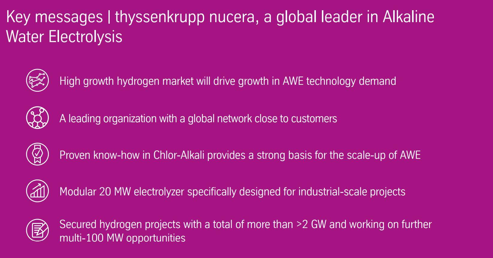 Die Ausrichtung auf mehr Nachhaltigkeit ist integraler Bestandteil der thyssenkrupp-Strategie. thyssenkrupp nucera ist dabei ein weltweit führender Anbieter für grünen Wasserstoff. Mit seiner Technologie unterstützt das Unternehmen seine Kunden auf dem Weg zur Klimaneutralität und zu einer dekarbonisierten Industrie. Mit einer Projekterfahrung von über fünf Dekaden, mehr als 600 abgeschlossenen Projekten, 240.000 produzierten Elektrolysezellen und über 10 Gigawatt installierter Elektrolyse-Leistung ist das Unternehmen ein Marktführer im Chlor-Alkali-Geschäft. Auf dieser starken Expertise gründet die alkalische Wasserelektrolyse, welche die Produktion von grünen Wasserstoff im großen Stil ermöglicht. Über einen standardisierten, modularen Ansatz lassen sich heute große Volumina an Wasserstoff bei geringen Kosten produzieren. thyssenkrupp nucera ist hierbei einer der europäischen Vorreiter in dieser Technologie.