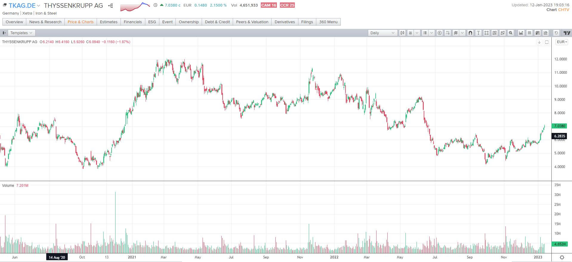 Leider mussten die Duisburger in 2022 den geplanten Börsengang von nucera auf unbestimmte Zeit verschieben, damit fehlt der Tochter wichtiges Wachstumskapital, welches jetzt über die Holding bereitgestellt werden muss. Durch die verbesserten Konzernzahlen in 2021/22 kann man nun aber wieder positiv in die Zukunft blicken. Im Jahr 2022 ließ die thyssenkrupp-Aktie mit minus 48% stark Federn, der Markt preiste entsprechende Risiken auf der Energie- und Rohstoffseite mit Abschlägen ein. Aktuell entspannen sich diese Belastungsfaktoren deutlich, das verschafft dem Konzern Luft zum Atmen. Für die Jahre 2023 und 2024 ist wieder Optimismus angebracht, denn wegen steigender öffentlicher Budgets für den Kampf gegen den Klimawandel ist die Auftragslage derzeit recht überzeugend. Bei Gesamtumsätzen von über 34 Mrd. EUR sollten mittelfristig wieder Vorsteuergewinne von 650 bis 950 Mio. EUR möglich sein. Derzeit ist der MDAX-Wert nur noch mit einer Marktkapitalisierung von 4,2 Mrd. EUR bewertet.