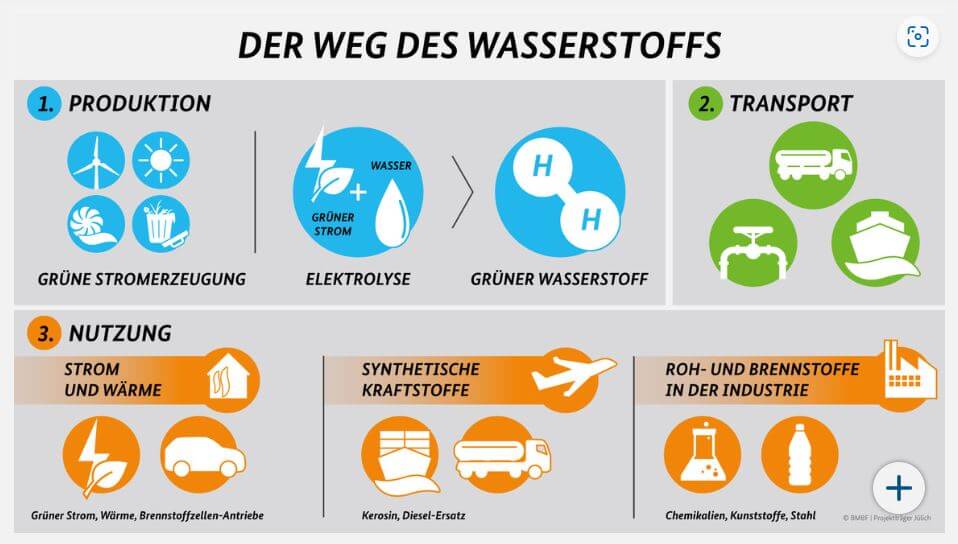 Die Bundesregierung hat die Nationale Wasserstoffstrategie im Jahr 2022 beschlossen. Sie soll grünen Wasserstoff marktfähig machen und seine industrielle Produktion, Transportfähigkeit und Nutzbarkeit ermöglichen. Denn grüner Wasserstoff ist zentral für das Erreichen der Pariser Klimaschutz-Ziele: Mit seiner Hilfe ist es möglich, Deutschlands größte Treibhausgas-Verursacher klimafreundlich umzugestalten und gleichzeitig den Technologiestandort Deutschland zu stärken. So die Theorie der Berliner Arbeitsgruppe "Energiewende".