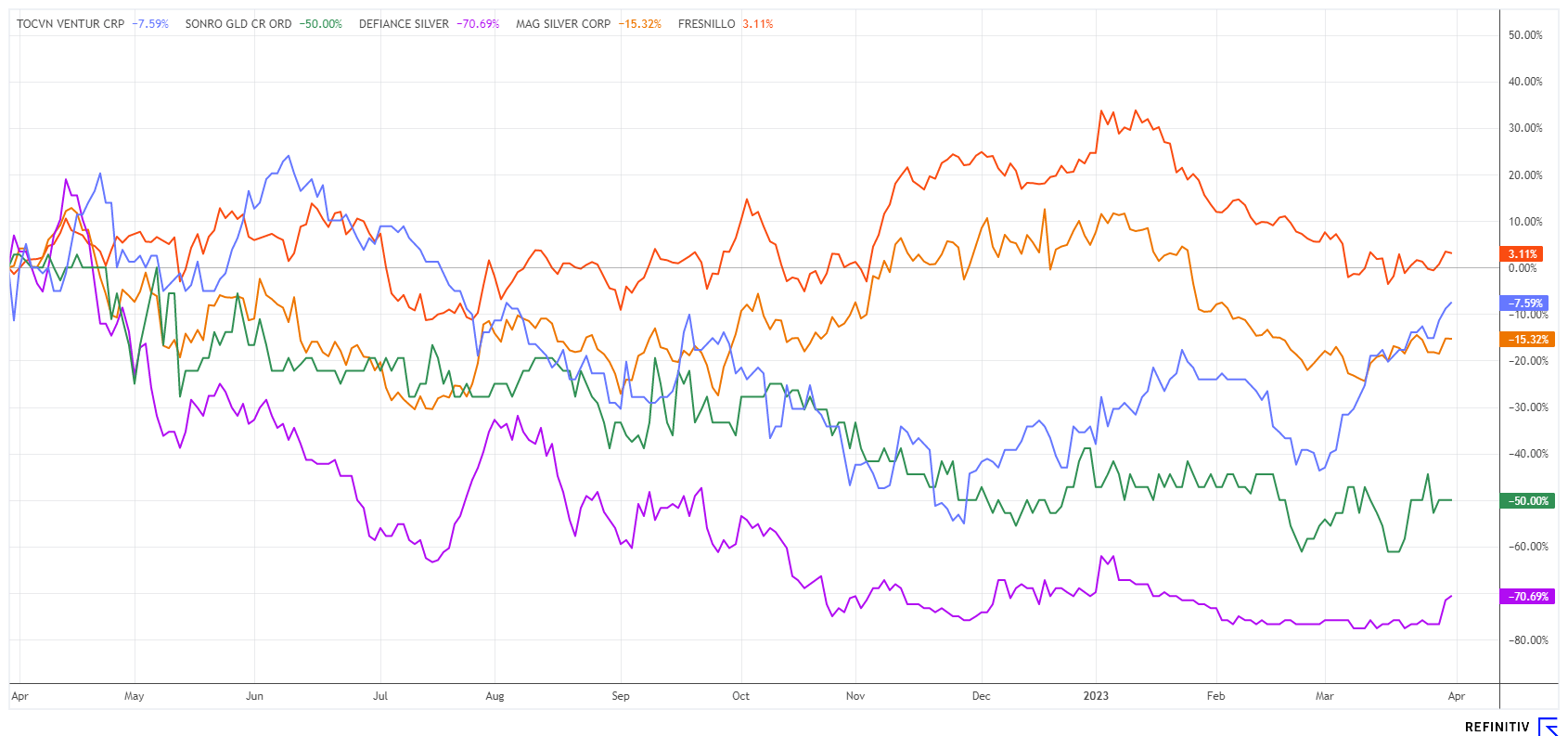 In einem 12-monatigen Performancevergleich liegt die TOC-Aktie nur knapp hinter dem Major Fresnillo und sogar noch vor MAG Silver, welche in der Gegend bereits seit Jahren erfolgreich fördern. Sonoro Gold und Definace Silver sind weitere Juniors, die sich in Mexico betätigen. Sie sind in der Kursentwicklung noch klar im Hintertreffen.