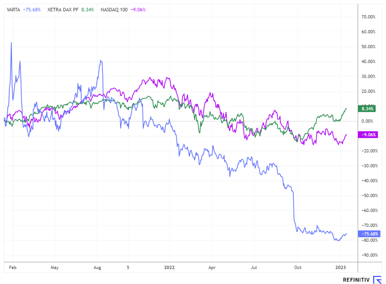 Mit der aktuellen Geschäftsplanung ist die Aktie mit einem Kurs-Umsatz-Verhältnis von 1,4 bewertet, diese Kennziffer hatte in 2021 auch schon mal Werte von über 5 erreicht. Auch im derzeitigen Umfeld ist zu erwarten, dass Varta seine produzierten Güter zwar verkaufen kann, der erzielbare Gewinn wird aber zu einem großen Teil durch die hohen Kosten aufgezehrt. Einen erneuerten Ausblick auf 2023 wird es mit der Präsentation der Jahreszahlen 2022 am 30.03.2023 geben. An dieser Stelle dürften dann auch die Ergebnisse der Kostenanpassungen feststehen, sie sollten mindestens 100 Mio. EUR betragen, um den operativen Trend zu drehen.