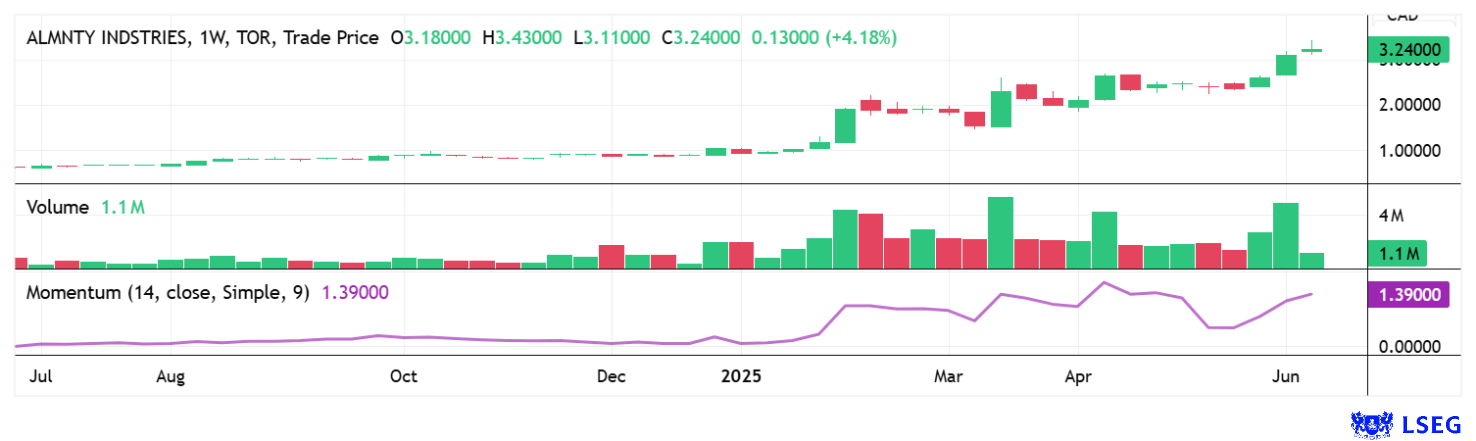 Wolfram, Molybdän und Seltene Erden gehören zu den äußerst kritischen Stoffen. Wie hoch die weltweite Knappheitssituation auf die Bewertung von Unternehmen durchschlagen kann, zeigt das Beispiel der MP Materials Corp aus den USA. Mit dem kalifornischen Mountain Pass Projekt besitzt das Unternehmen die größte Seltene Erden-Liegenschaft der westlichen Welt. Der Umsatz wird im vergangenen Jahr 2024 auf etwa 265 Mio. USD taxiert, im Jahr 2019 hatte er noch 73 Mio. USD betragen. Bis 2028e halten die Analysten mit den zuletzt gestiegenen Terminpreisen auf der Plattform LSEG einen Erlösanstieg auf rund 796 Mio. USD für möglich. Bewertet ist MP Materials derzeit mit knapp 4,6 Mrd. USD, also rund 7-mal der heutigen Almonty Industries. Natürlich werden sich die Umsätze der Unternehmen unterschiedlich entwickeln, denn die Verfügbarkeit der Metalle wird über den Weltmarkt definiert. Die Ausgangssituation von Almonty Industries zeigt aber im vergleich zum US-Konkurrenten eine deutlich niedrigere Bewertung. Die baldige Notiz an der NASDAQ bietet ein perfektes Set-Up für anstehende Peergroup-Vergleiche. Hier kann Almonty mit noch niedrigen Multiplikatoren deutlich punkten!