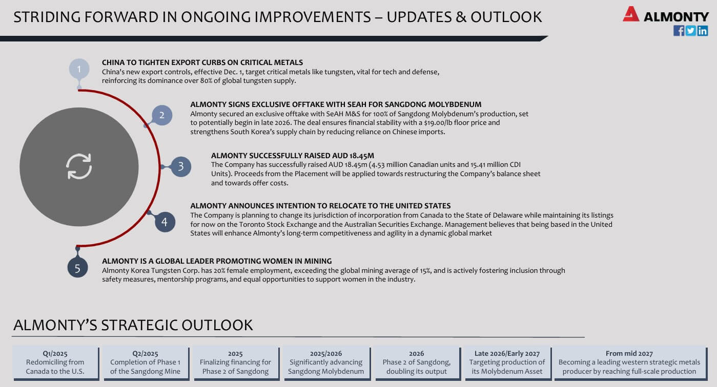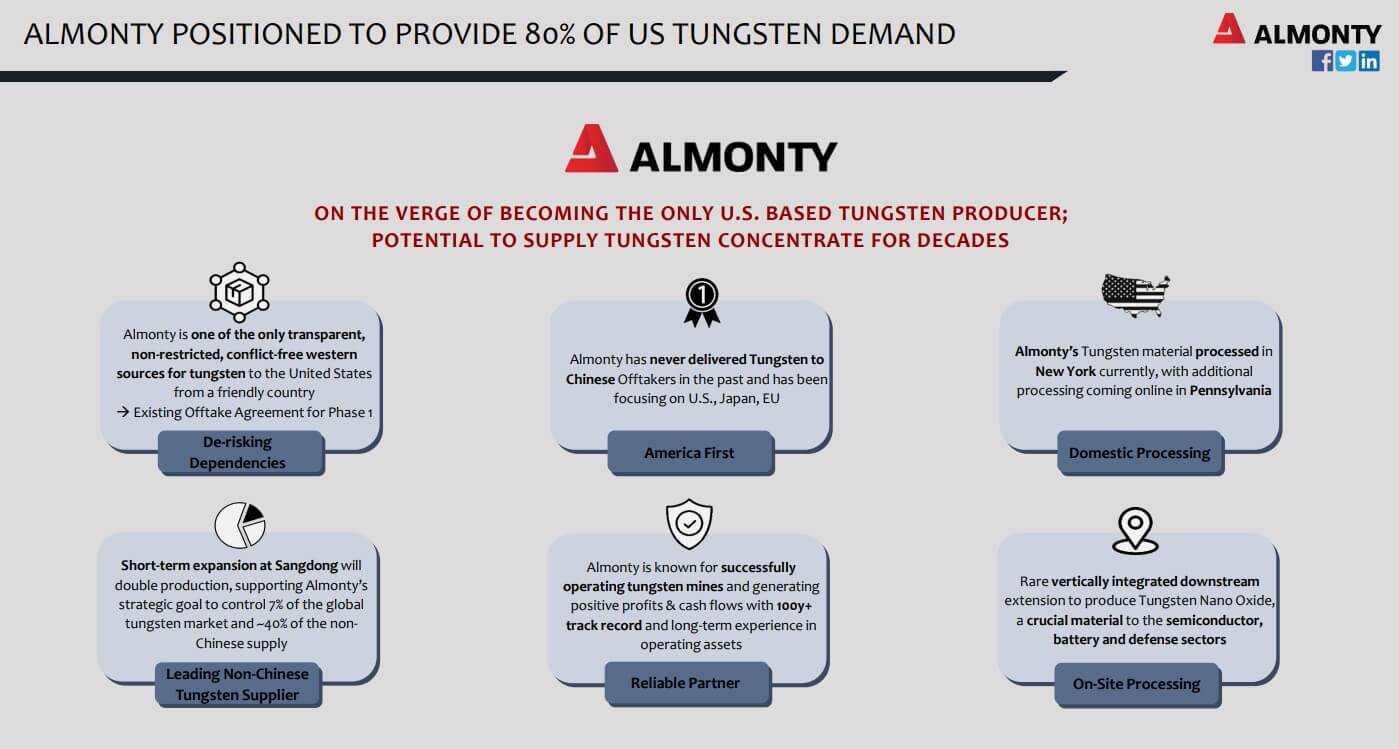 CEO und President Lewis Black kommentierte: „Diese Anerkennung durch führende Mitglieder des US-Kongresses bestätigt, dass das Sangdong-Projekt von Almonty weit mehr als ein kommerzielles Unterfangen ist – es ist eine strategische Infrastruktur, die für die Sicherheit und Widerstandsfähigkeit der Lieferketten der USA und ihrer Verbündeten von entscheidender Bedeutung ist. Während wir uns auf die Verlegung unseres Firmensitzes in die Vereinigten Staaten vorbereiten, ist es unser Ziel, mehr als nur ein Lieferant zu sein. Wir positionieren Almonty als vertrauenswürdigen Partner für die Rückverlagerung und die Verlagerung kritischer Mineralienkapazitäten in Zeiten, in denen geopolitische Zwänge mehr Transparenz, Zuverlässigkeit und Kontrolle durch Verbündete erfordern. Wir stehen in vollem Einklang mit den nationalen Sicherheitsprioritäten der USA und konzentrieren uns weiterhin darauf, unseren Aktionären langfristigen Wert zu bieten.“