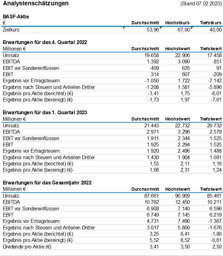 BASF legte Anfang Februar vorläufige Zahlen für das Gesamtjahr 2022 vor. Bei Umsatz und Ergebnis der Betriebstätigkeit (EBIT) vor Sondereinflüssen liegt der Konzern mit voraussichtlich 87,3 Mrd. EUR und 6,87 Mrd. EUR in den zuvor prognostizierten Bandbreiten sowie auf dem Niveau der durchschnittlichen Analystenschätzungen für 2022.