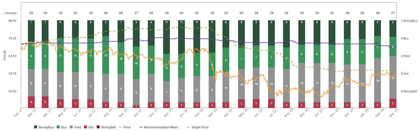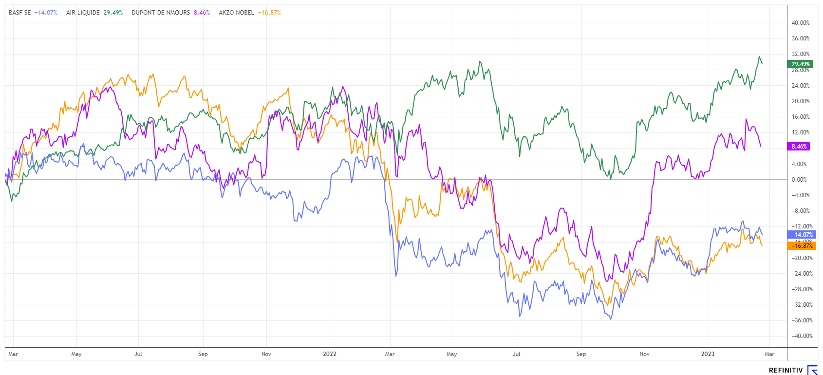 Der zweijährige Kursverlauf der BASF-Aktie im Vergleich zu seiner Sektor-Peergroup zeigt insbesondere gegenüber Air Liquide und DuPont große Rückstände. Als Begründung lassen sich natürlich die Sonderbelastungen in Russland anführen. Sollte die Konjunktur anders als von vielen Ökonomen in 2023 tatsächlich nach oben drehen, wären bei BASF die Segel gesetzt. Der Barclays-Experte Alex Stewart empfiehlt die Papiere der Ludwigshafener mit einem Kursziel von 68 EUR, hat seine Einstufung aber bei "Equalweight" belassen. Es gibt erste Erholungssignale für die Branche, weshalb er auf Zwölfmonatssicht insgesamt positiv eingestellt ist. Anders als in den vergangenen drei Aufwärtszyklen sollten Anleger sich mittelfristig aber auf das Risiko einer Stagflation der Wirtschaft einstellen, so der Analyst.