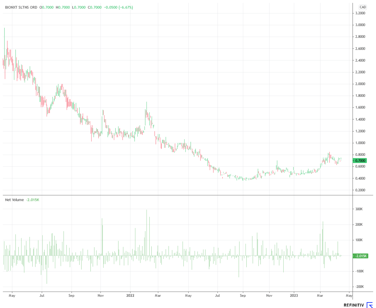 Blickt man auf den Kursverlauf der Aktie innerhalb der vergangenen zwei Jahre, so zeichnet sich seit dem vergangenen Sommer eine Bodenbildung ab. Da BioNxt Solutions parallel auch operativ große Fortschritte macht und rund um die Bereiche Biosensoren und innovative Darreichungsformen für Medikamente mittelfristig nennenswerte Umsätze winken, könnte die Aktie auf dem aktuellen Niveau aussichtsreich sein. Auch das dritte Geschäftsfeld, auf dem das Unternehmen an Psychedelika forscht, könnte von den jüngsten operativen Fortschritten profitieren. Die charttechnische Ausgangslage ist insbesondere vor dem Hintergrund des zu erwartenden Newsflows vielversprechend.