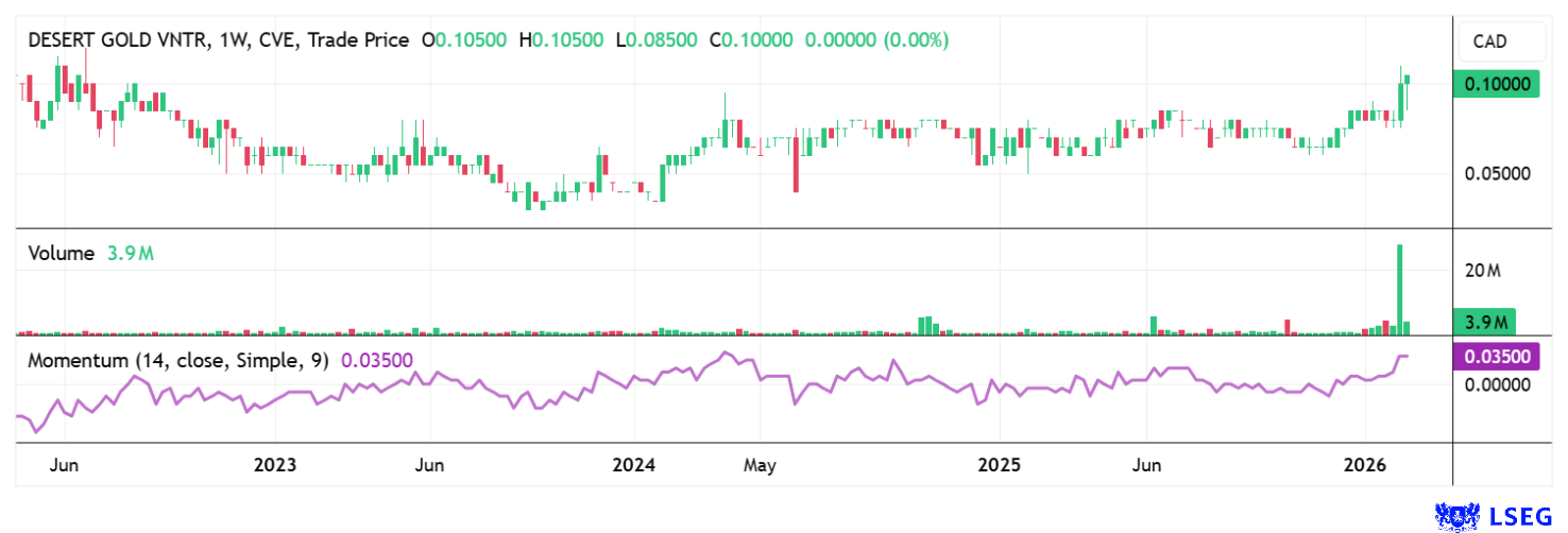 Desert Gold kommt mit nun 2 Liegenschaften und der Aussicht auf eine deutliche Ressourcenausdehnung sowie dem Start einer kleinen Produktion ins Rampenlicht. Bei einer Aktienzahl von ca. 360 Mio. Stück nach der aktuellen Finanzierung ist die Kasse prall gefüllt. Anfang Februar markierte Desert Gold mit 0,11 CAD ein neues 3-Jahreshoch. Teilweise wechselten über 10 Mio. Aktien den Besitzer. Damit fiel auch der mehrmonatige Widerstand bei 0,08 CAD, der sich seit den letzten Finanzierungen als recht hartnäckig erwies.