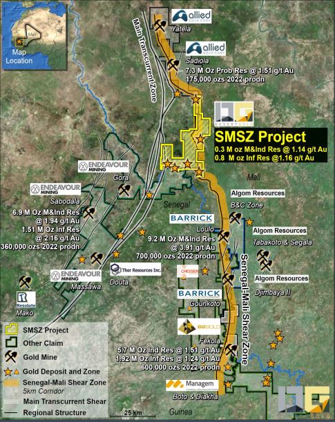 Die Nachrichtenlage für den kanadischen Explorer Desert Gold (WKN: A14X09 | ISIN: CA25039N4084 | Ticker-Symbol: QXR2 | TSX-V: DAU) könnten derzeit nicht besser sein. Denn der fündige Explorer operiert in einer der wenigen Regionen weltweit, in denen Geologie, Historie und Infrastruktur eine nahezu ideale Schnittmenge bilden: der Senegal-Mali-Shear-Zone (SMSZ). Dieser Strukturkorridor hat in den vergangenen Jahrzehnten Lagerstätten mit mehreren Millionen Unzen hervorgebracht und zu einer Ansiedlung bekannter Minenkonzerne wie Barrick Mining, B2Gold oder Allied Gold geführt. Die kleine Desert Gold kontrolliert hier rund 440 km² zusammenhängendes Land – heute ein strategisches Asset zwischen aktiven Großminen. Entscheidend aus analytischer Sicht: Die goldführenden Strukturen sind regional durchgängig. Die Wahrscheinlichkeit, dass sich mineralisierte Trends über die Lizenzgrenzen hinweg fortsetzen, ist hoch und durch benachbarte Minen eindrucksvoll belegt.