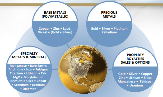 Breite Diversifikation in Edelmetalle, Bunt- und Polymetalle sowie Sondermetalle und seltene Mineralien. Über 100 Royalties und einige Optionen.