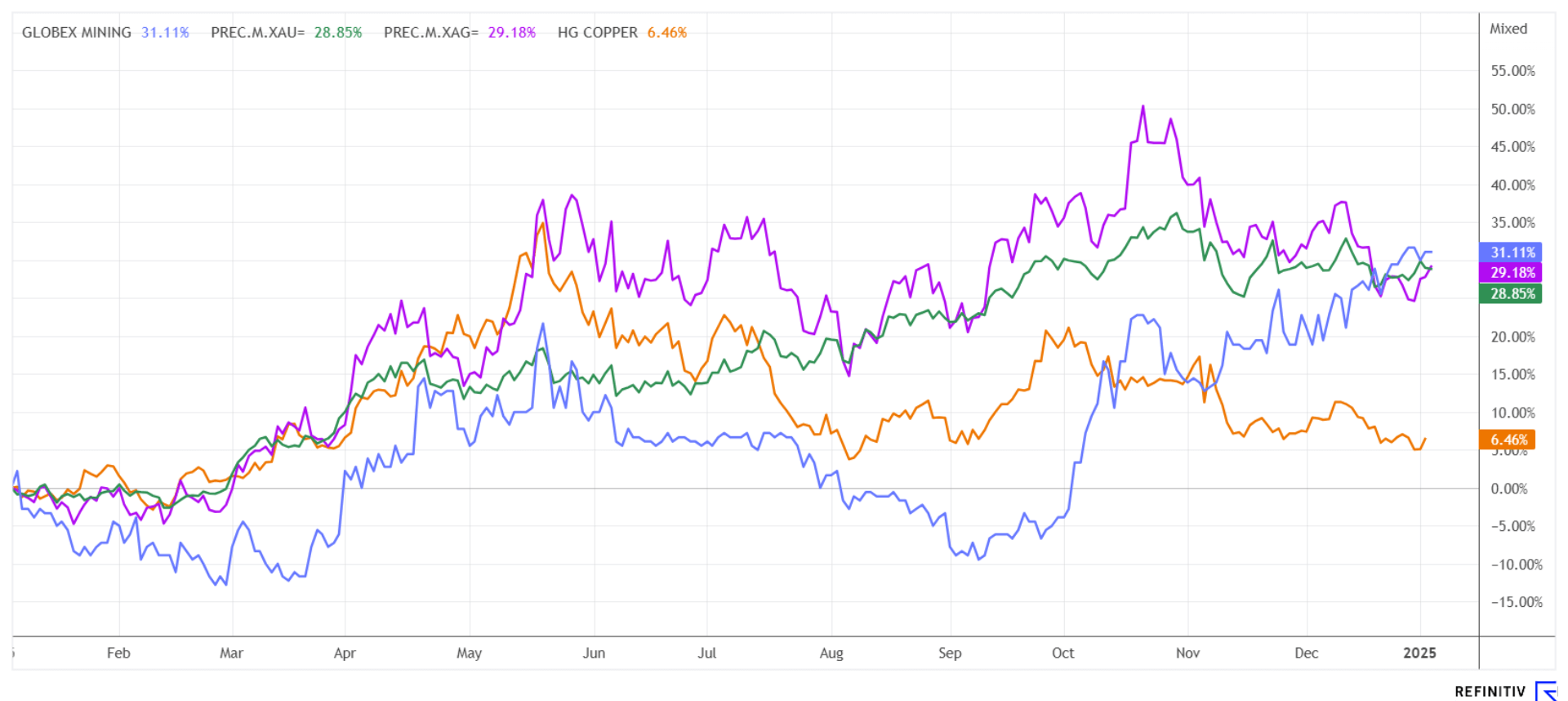 Kurz vor der Jahreswende 2025 meldet das Unternehmen eine Transaktion mit Electro Metals and Mining Inc. bezüglich des zu 100 % im Besitz von Globex befindlichen Minengrundstücks Magusi-Fabie. Dieses besteht aus 154 Claims und einer Bergbaupacht in den Gemeinden Hebecourt, Duparquet, Duprat und Montbray in Quebec, 55 Kilometer nordwestlich von Rouyn-Noranda. Gemäß den Bedingungen des Abkommens wird Electro an Globex 3,5 Mio. CAD in bar über vier Jahre zahlen, einschließlich 100.000 CAD bis spätestens 31. Januar 2025. Übertragen werden auch 4 Mio. Electro-Stammaktien bis Ende Januar und weitere 2 Mio. Aktien am vierten Jahrestag des Deals. Electro Metals wird 8,35 Mio. CAD in die Entwicklung des Grundstücks investieren, einschließlich mindestens 650.000 CAD im ersten Jahr. Bei kommerzieller Produktion wird Globex inflationsindexiert 1 Mio. CAD erhalten. Wenn Electro eine 100-prozentige Beteiligung am Grundstück erwirbt, wird Globex eine 3 %-Bruttometall-Lizenzgebühr (GMR) einbehalten, die durch die Zahlung von 2 Mio. CAD auf eine 2 %-GMR reduziert werden kann. Darüber hinaus behält Globex Zahlungen von 200.000 CAD pro Jahr ein (zur Hälfte in bar und zur Hälfte in Aktien), die ab dem sechsten Jahrestag zahlbar sind.