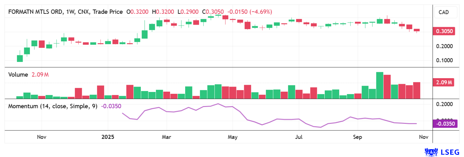 Formation Metals has successfully completed its latest financing rounds, raising a total of approximately CAD 16.7 million. In two tranches, 35.1 million units were issued at CAD 0.37 (LIFE) and 16.7 million units at CAD 0.54 (flow-through). The same number of warrants with exercise prices between CAD 0.54 and CAD 0.62 and a three-year exercise period were issued in each case. Following completion of the financing, the Company has approximately CAD 12.7 million in working capital and remains debt-free. Including tax credits from the Province of Québec, the exploration budget for 2025 to 2026 is approximately CAD 8.1 million. This will enable the expanded 30,000-meter drill program to be carried out without additional financing. Formation Metals is benefiting from the current positive sentiment in the junior mining sector and can now go full steam ahead.