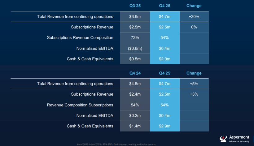 The fourth quarter of 2025 marks further progress for Aspermont. The Company reports growing subscription revenues for the 37th consecutive quarter and confirms significant progress in the expansion of its data intelligence business. Annual recurring revenue (ARR) rose to AUD 11.2 million, while total revenue from ongoing business increased by 5% to AUD 4.7 million. EBITDA was AUD 0.4 million, and net cash reserves increased to AUD 2.9 million through a AUD 1.75 million institutional placement with a 40% premium. The highlight of recent developments was clearly the first corporate contract with Rio Tinto worth AUD 550,000, which includes the digitization of historical archive data and the development of an AI-powered generative search and analysis platform. In the events business, the "Future of Mining Australia" mining conference saw a 20% increase in visitor numbers, demonstrating the steady expansion of the Company's reach in the physical space as well.