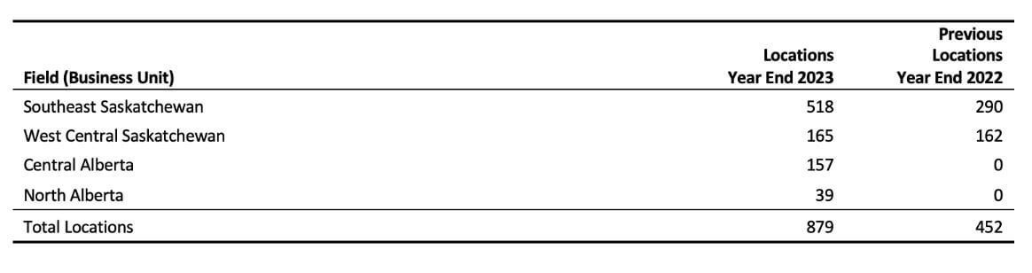 As a result of the successful 2023 drilling program and the acquisition of Ridgeback, Saturn's average oil and gas production in the fourth quarter of 2023 was approximately 26,890 BOE/day, and average production reached approximately 28,000 BOE/day in December 2023. The reserve report includes 680 gross drilling locations (576.6 net) in Saskatchewan and 199 gross drilling locations (150.6 net) in Alberta. The Company has an internally estimated additional 550 gross drilling locations (450 net) in Alberta and Saskatchewan, which, when combined with the booked locations in the reserve report, represent over 20 years of drilling inventory.