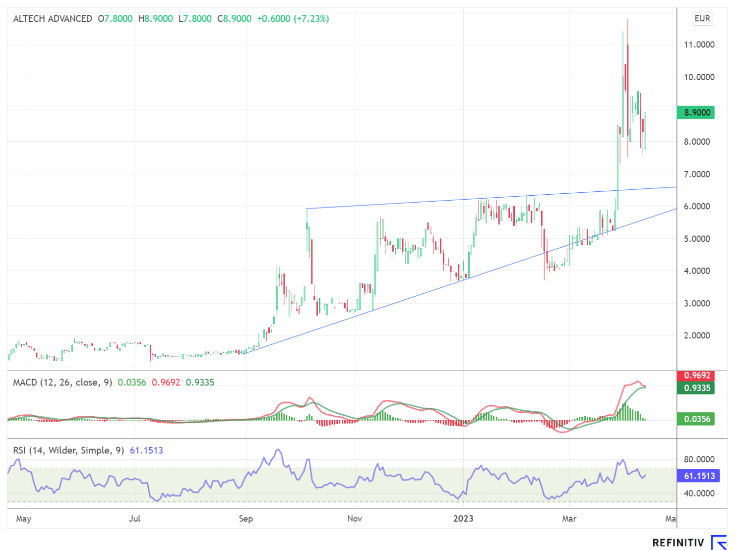 Altech Advanced Materials could be the new innovation driver,"Made in Germany". Both the novel Silumina Anodes coating technology and the CERENERGY battery storage technology, which is being developed together with the Fraunhofer Institute for Ceramic Technologies and Systems, have enormous potential. Altech Advanced Materials currently has a stock market value of EUR 62.86 million. Due to the price fireworks of the past weeks, the share is in consolidation. However, should the start of the pilot plant go ahead as planned, this should boost the share again. As an interested market participant, however, the value should be limited when buying due to its market narrowness.