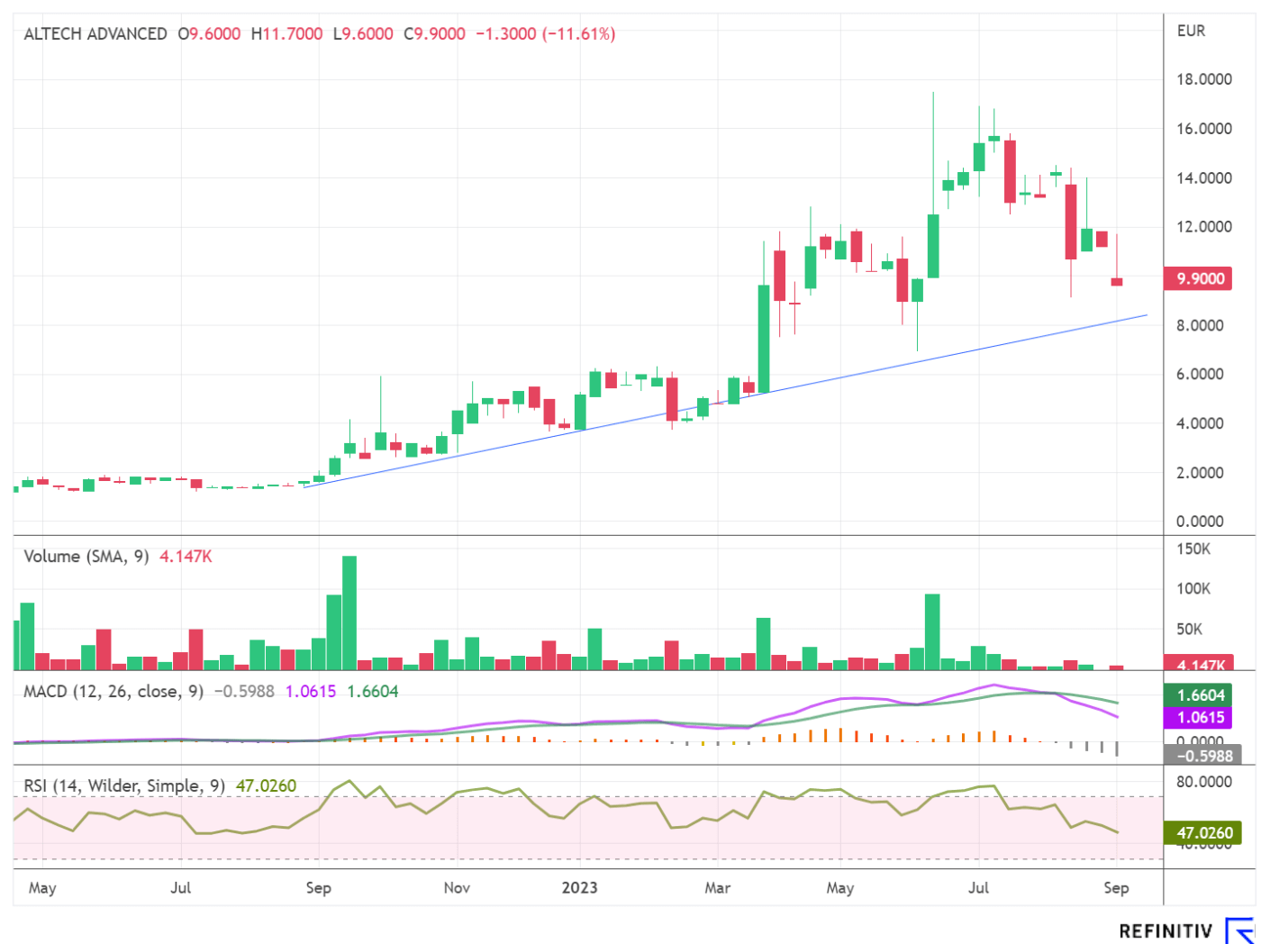 The news situation at Altech Advanced Materials remains quiet. This is mirrored by the development of the share, which was included in Xetra trading in mid-July. Since mid-June, the share price has corrected from its all-time high of EUR 17.50 under low volume to currently EUR 9.90. Nevertheless, the innovation leader in anode composite materials for lithium-ion batteries as well as for environmentally friendly stationary energy storage systems based on sodium-alumina solid state batteries has been one of the market outperformers since the beginning of the year, with a gain of 164%.